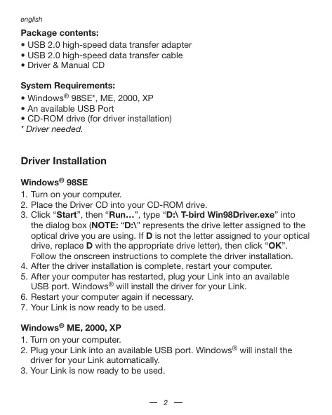 - Click "Start", then "Run...", type "D:\T-bird Win98Driver.exe" into the dialog box (NOTE: "D:\") represents the drive letter assigned to the optical drive you are using. If D is not the letter assigned to your optical drive, replace D with the appropriate drive letter), then click "OK". Follow the onscreen instructions to complete the driver installation.