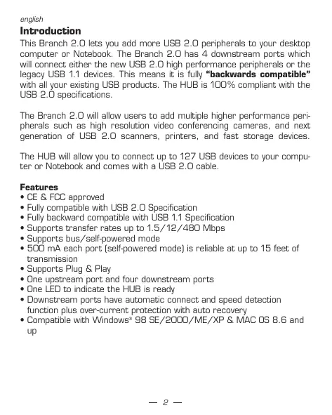 This Branch 2.0 lets you add more USB 2.0 peripherals to your desktop computer or Notebook. The Branch 2.0 has 4 downstream ports which will connect either the new USB 2.0 high performance peripherals or the legacy USB 1.1 devices. This means it is fully "backwards compatible" with all your existing USB products. The HUB is 100% compliant with the USB 2.0 specifications.