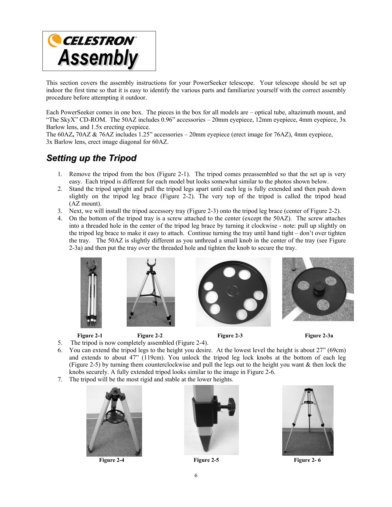 Azimuth Lock Accessory Tray Tripod Alt-Az Mount Altitude Lock Focus Knob This section covers the assembly instructions for your PowerSeeker telescope. Your telescope should be set up indoor the first time so that it is easy to identify the various parts and familiarize yourself with the correct assembly procedure before attempting it outdoor. Each PowerSeeker comes in one box. The pieces in the box for all models are – optical tube, altazimuth mount, and “The SkyX” CD-ROM. The 50AZ includes 0.96” accessories – 20mm eyepiece, 12mm eyepiece, 4mm eyepiece, 3x Barlow lens, and 1.5x erecting eyepiece. The 60AZ, 70AZ & 76AZ includes 1.25” accessories – 20mm eyepiece (erect image for 76AZ), 4mm eyepiece, 3x Barlow lens, erect image diagonal for 60AZ. Setting up the Tripod