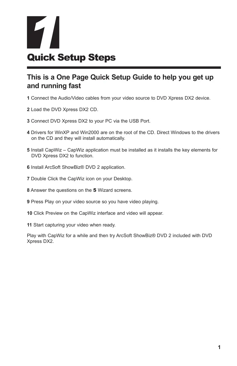 Quick Setup Steps This is a One Page Quick Setup Guide to help you get up and running fast 1 Connect the Audio/Video cables from your video source to DVD Xpress DX2 device. 2 Load the DVD Xpress DX2 CD. 3 Connect DVD Xpress DX2 to your PC via the USB Port. 4 Drivers for WinXP and Win2000 are on the root of the CD. Direct Windows to the drivers on the CD and they will install automatically. 5 Install CapWiz – CapWiz application must be installed as it installs the key elements for DVD Xpress DX2 to function. 6 Install ArcSoft ShowBiz® DVD 2 application. 7 Double Click the CapWiz icon on your Desktop. 8 Answer the questions on the 5 Wizard screens. 9 Press Play on your video source so you have video playing. 10 Click Preview on the CapWiz interface and video will appear. 11 Start capturing your video when ready. Play with CapWiz for a while and then try ArcSoft ShowBiz® DVD 2 included with DVD Xpress DX2.