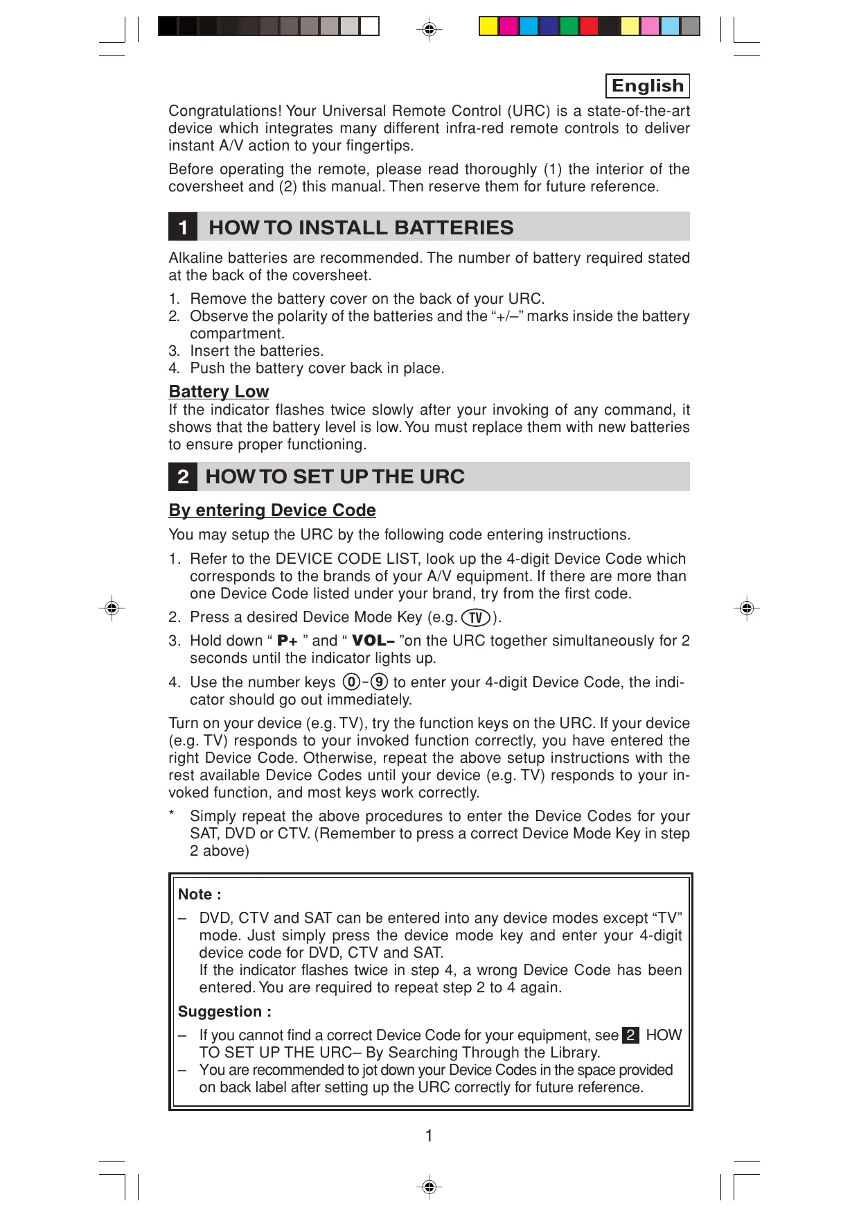 SAT, DVD or CTV. (Remember to press a correct Device Mode Key in step 2 above) Note : – DVD, CTV and SAT can be entered into any device modes except “TV” mode. Just simply press the device mode key and enter your 4-digit device code for DVD, CTV and SAT. If the indicator flashes twice in step 4, a wrong Device Code has been entered. You are required to repeat step 2 to 4 again. Suggestion : – If you cannot find a correct Device Code for your equipment, see 2 HOW TO SET UP THE URC– By Searching Through the Library. – You are recommended to jot down your Device Codes in the space provided on back label after setting up the URC correctly for future reference.