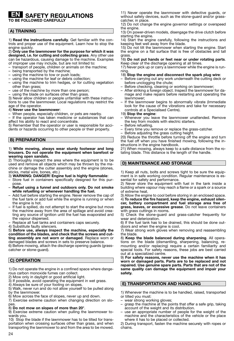 1) Toujours porter des chaussures résistantes et des pantalons longs pendant la tonte. Ne pas utiliser le matériel lorsque l’on est pieds nus ou en sandales. 2) Inspecter minutieusement toute la zone à tondre et éliminer tout objet étranger qui pourrait être projeté par la machine ou endommager l'ensemble de coupe et le moteur (pierres, morceaux de bois, fils de fer, os, etc..). 3) ATTENTION: DANGER! L’essence est hautement inflammable: – conserver le carburant dans des récipients spécialement prévus à cet effet; – faire le plein à l’aide d’un entonnoir, à l’extérieur uniquement et ne pas fumer pendant cette opération ou pendant toute manipulation de carburant; – ajouter de l’essence avant de démarrer le moteur et ne jamais enlever le bouchon du réservoir de carburant ou faire le plein lorsque le moteur est en fonctionnement ou tant qu’il est encore chaud; – ne pas démarrer le moteur si de l’essence a été répandue. Éloigner la tondeuse de la zone où le carburant a été renversé et ne provoquer aucune inflammation tant que le carburant ne s’est pas évaporé et que les vapeurs ne se sont pas dissipées; – remettre et serrer correctement les bouchons du réservoir et du récipient. 4) Remplacer les silencieux d’échappement défectueux. 5) Avant l’utilisation, toujours procéder à une vérification générale et en particulier de l’aspect des lames, des vis de fixation et de l’ensemble de coupe pour s’assurer qu’ils ne sont ni usés ni endommagés. Remplacer les lames et les vis endommagées ou usées par lots complets pour préserver le bon équilibrage. 6) Avant de commencer le travail, monter les protections (sac et déflecteur).