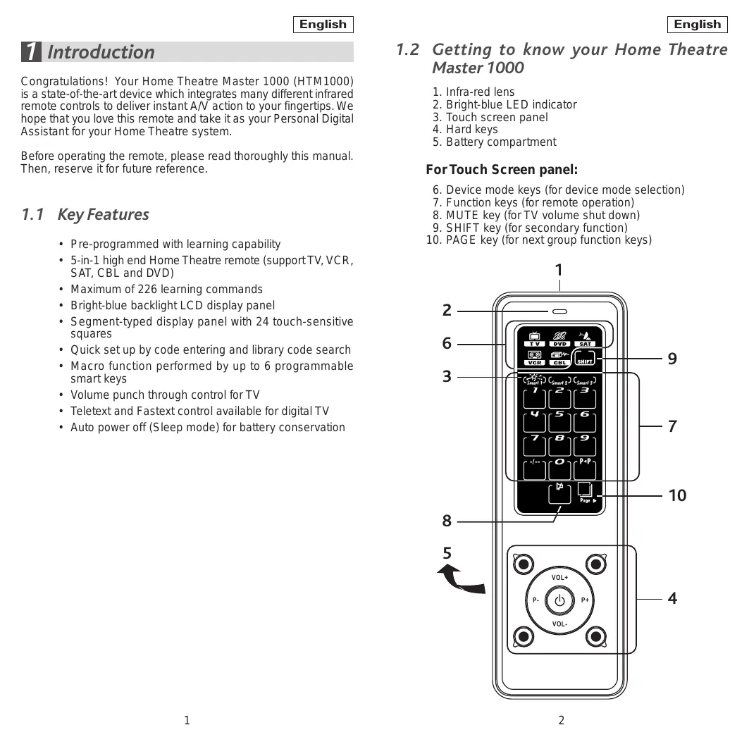 Congratulations! Your Home Theatre Master 1000 (HTM1000) is a state-of-the-art device which integrates many different infrared remote controls to deliver instant A/V action to your fingertips. We hope that you love this remote and take it as your Personal Digital Assistant for your Home Theatre system. Before operating the remote, please read thoroughly this manual. Then, reserve it for future reference.