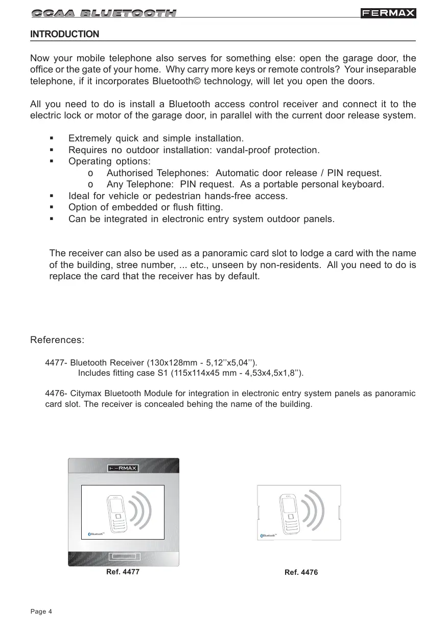 Code 97091c V02_08 Technical publication for information purposes, edited by FERMAX ELECTRÓNICA S.A.E. FERMAX ELECTRÓNICA S.A.E., in a policy of ongoing improvement, reserves the right to modify the contents of this document and the features of the products cited herein at any time and with no prior notice. Any modification shall be reflected in subsequent editions of this document. ENGLISH Page 2 CCAA BLUETOOTH INTRODUCTION Now your mobile telephone also serves for something else: open the garage door, the office or the gate of your home. Why carry more keys or remote controls? Your inseparable telephone, if it incorporates Bluetooth© technology, will let you open the doors. All you need to do is install a Bluetooth access control receiver and connect it to the electric lock or motor of the garage door, in parallel with the current door release system.