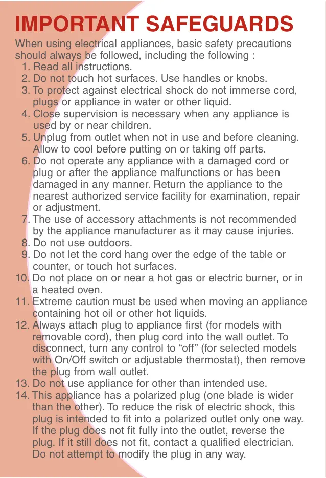 - This appliance has a polarized plug (one blade is wider than the other). To reduce the risk of electric shock, this plug is intended to fit into a polarized outlet only one way. If the plug does not fit fully into the outlet, reverse the plug. If it still does not fit, contact a qualified electrician. Do not attempt to modify the plug in any way.