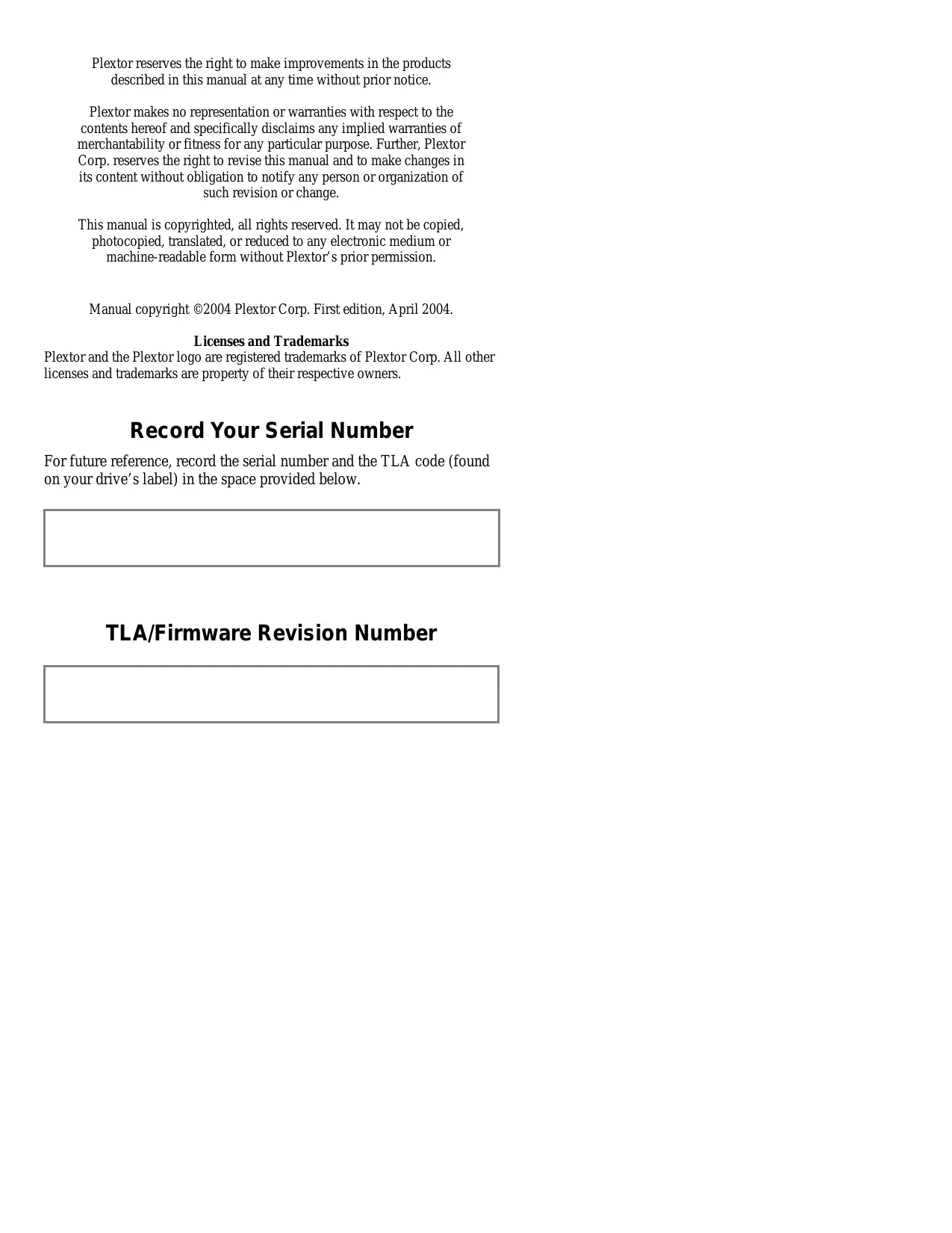 Plextor reserves the right to make improvements in the products described in this manual at any time without prior notice. Plextor makes no representation or warranties with respect to the contents hereof and specifically disclaims any implied warranties of merchantability or fitness for any particular purpose. Further, Plextor Corp. reserves the right to revise this manual and to make changes in its content without obligation to notify any person or organization of such revision or change. This manual is copyrighted, all rights reserved. It may not be copied, photocopied, translated, or reduced to any electronic medium or machine-readable form without Plextor’s prior permission. Manual copyright ©2004 Plextor Corp. First edition, A pril 2004. Licenses and Trademarks Plextor and the Plextor logo are registered trademarks of Plextor Corp. All other licenses and trademarks are property of their respective owners. Record Your Serial Number For future reference, record the serial number and the TLA code (found on your drive’s label) in the space provided below. TLA/Firmware Revision Number