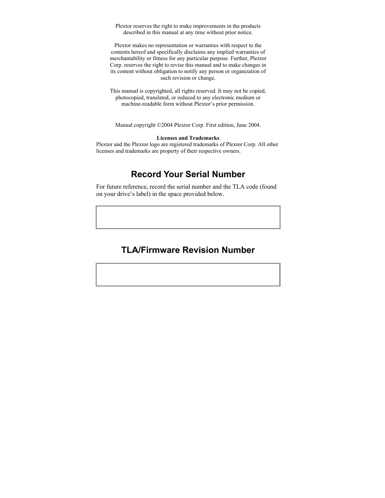 Plextor reserves the right to make improvements in the products described in this manual at any time without prior notice. Plextor makes no representation or warranties with respect to the contents hereof and specifically disclaims any implied warranties of merchantability or fitness for any particular purpose. Further, Plextor Corp. reserves the right to revise this manual and to make changes in its content without obligation to notify any person or organization of such revision or change. This manual is copyrighted, all rights reserved. It may not be copied, photocopied, translated, or reduced to any electronic medium or machine-readable form without Plextor’s prior permission. Manual copyright ©2004 Plextor Corp. First edition, June 2004. Licenses and Trademarks Plextor and the Plextor logo are registered trademarks of Plextor Corp. All other licenses and trademarks are property of their respective owners. Record Your Serial Number For future reference, record the serial number and the TLA code (found on your drive’s label) in the space provided below. TLA/Firmware Revision Number