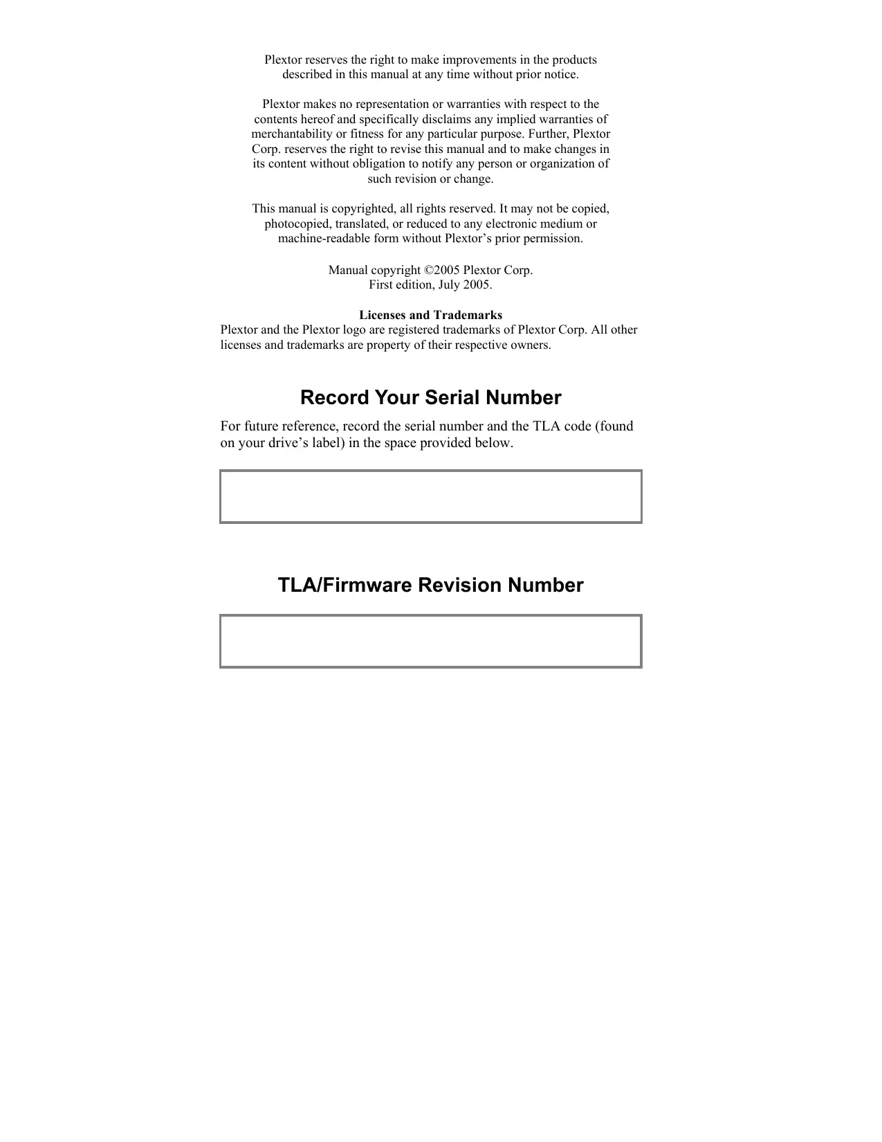 Plextor reserves the right to make improvements in the products described in this manual at any time without prior notice. Plextor makes no representation or warranties with respect to the contents hereof and specifically disclaims any implied warranties of merchantability or fitness for any particular purpose. Further, Plextor Corp. reserves the right to revise this manual and to make changes in its content without obligation to notify any person or organization of such revision or change. This manual is copyrighted, all rights reserved. It may not be copied, photocopied, translated, or reduced to any electronic medium or machine-readable form without Plextor’s prior permission. Manual copyright ©2005 Plextor Corp. First edition, July 2005. Licenses and Trademarks Plextor and the Plextor logo are registered trademarks of Plextor Corp. All other licenses and trademarks are property of their respective owners. Record Your Serial Number For future reference, record the serial number and the TLA code (found on your drive’s label) in the space provided below. TLA/Firmware Revision Number