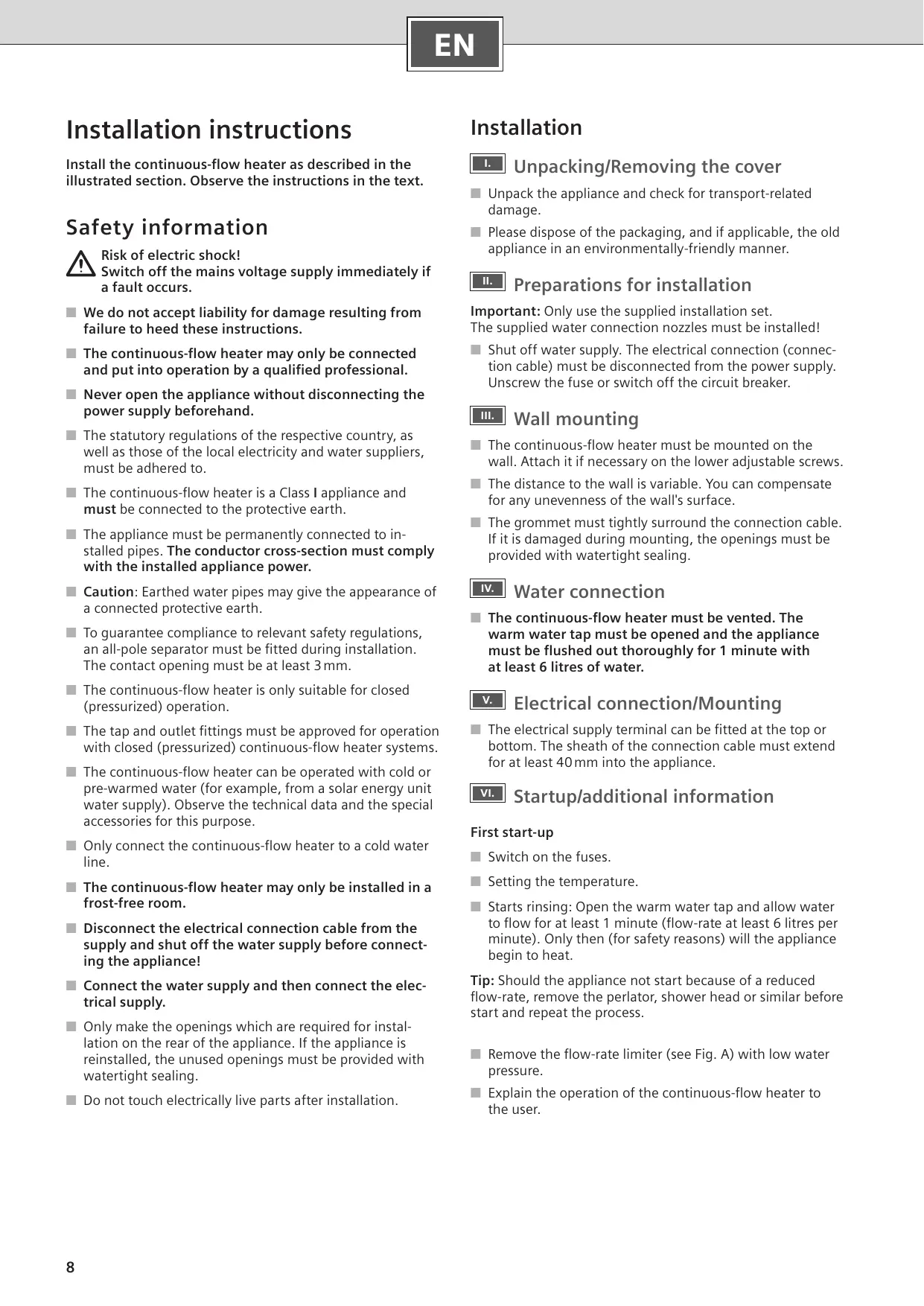 (débit au moins 6 litres par minute). L’appareil commence ensuite à chauffer (sécurité). Si l’appareil ne démarre pas en raison d’un débit trop faible, retirer le brise-jet, la pomme de douche ou tout élément similaire pour le démarrage et répéter le processus.