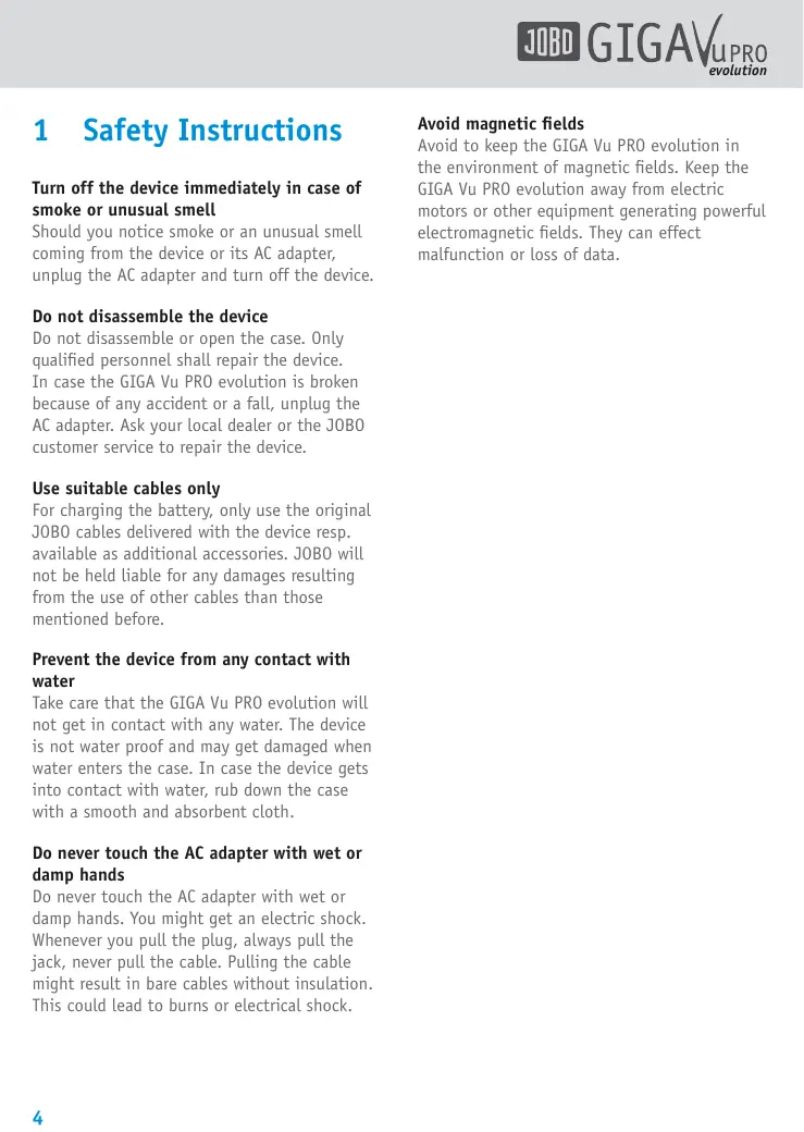 1 Safety Instructions Turn off the device immediately in case of smoke or unusual smell Should you notice smoke or an unusual smell coming from the device or its AC adapter, unplug the AC adapter and turn off the device. Do not disassemble the device Do not disassemble or open the case. Only qualified personnel shall repair the device. In case the GIGA Vu PRO evolution is broken because of any accident or fall, unplug the AC adapter. Ask your Local dealer or the J0B0 customer service to repair the device. Use suitable cables only For charging the battery, only use the original 3080 cables delivered with the device resp. available as additional accessories. J0BO will not be held liable for any damages resulting from the use of other cables than those mentioned before. Prevent the device from any contact with water Take care that the GIGA Vu PRO evolution will not get in contact with any water. The device is not water proof and may get damaged when water enters the case. In case the device gets into contact with water, rub down the case with a smooth and absorbent cloth. Do never touch the AC adapter with wet or damp hands Do never touch the AC adapter with wet or damp hands. You might get an electric shock. Whenever you pull the plug, always pull the jack, never pull the cable. Pulling the cable might result in bare cables without insulation. This could Lead to burns or electrical shock. ED GIGA Verre Avoid magnetic fields Avoid to keep the GIGA Vu PRO evolution in the environment of magnetic fields. Keep the GIGA Vu PRO evolution away from electric motors or other equipment generating powerful electromagnetic fields. They can effect malfunction or Loss of data.
