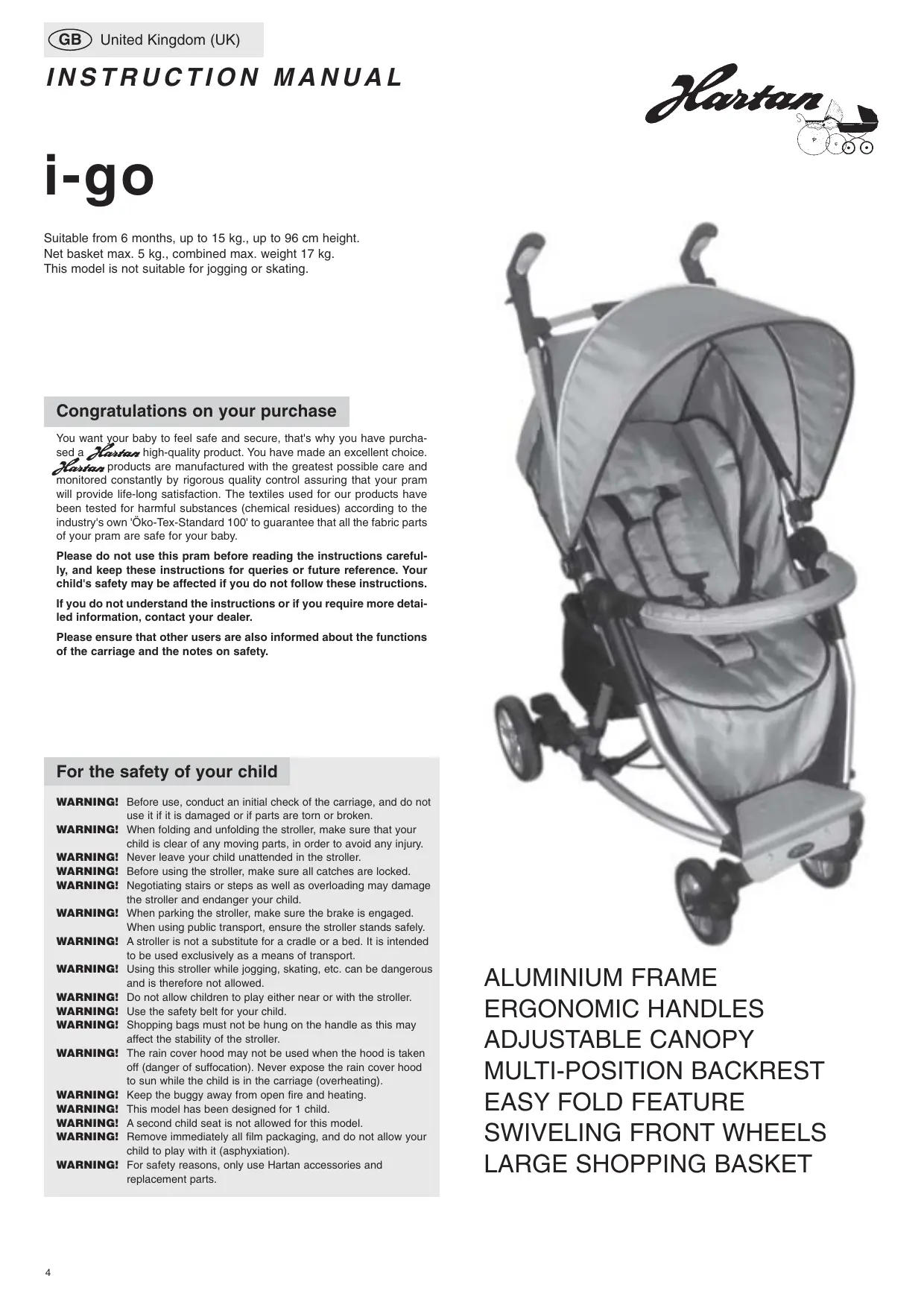 United Kingdom (UK) INSTRUCTION MANUAL i-go Suitable from 6 months, up to 15 kg., up to 96 cm height. Net basket max. 5 kg., combined max. weight 17 kg. This model is not suitable for jogging or skating. Congratulations on your purchase You want your baby to feel safe and secure, that's why you have purchased a high-quality product. You have made an excellent choice. products are manufactured with the greatest possible care and monitored constantly by rigorous quality control assuring that your pram will provide life-long satisfaction. The textiles used for our products have been tested for harmful substances (chemical residues) according to the industry's own 'Öko-Tex-Standard 100' to guarantee that all the fabric parts of your pram are safe for your baby. Please do not use this pram before reading the instructions carefully, and keep these instructions for queries or future reference. Your child's safety may be affected if you do not follow these instructions. If you do not understand the instructions or if you require more detailed information, contact your dealer. Please ensure that other users are also informed about the functions of the carriage and the notes on safety. For the safety of your child WARNING! Before use, conduct an initial check of the carriage, and do not use it if it is damaged or if parts are torn or broken. WARNING! When folding and unfolding the stroller, make sure that your child is clear of any moving parts, in order to avoid any injury. WARNING! Never leave your child unattended in the stroller. WARNING! Before using the stroller, make sure all catches are locked. WARNING! Negotiating stairs or steps as well as overloading may damage the stroller and endanger your child. WARNING! When parking the stroller, make sure the brake is engaged. When using public transport, ensure the stroller stands safely. WARNING! A stroller is not a substitute for a cradle or a bed. It is intended to be used exclusively as a means of transport. WARNING! Using this stroller while jogging, skating, etc. can be dangerous and is therefore not allowed. WARNING! Do not allow children to play either near or with the stroller. WARNING! Use the safety belt for your child. WARNING! Shopping bags must not be hung on the handle as this may affect the stability of the stroller. WARNING! The rain cover hood may not be used when the hood is taken off (danger of suffocation). Never expose the rain cover hood to sun while the child is in the carriage (overheating). WARNING! Keep the buggy away from open fire and heating. WARNING! This model has been designed for 1 child. WARNING! A second child seat is not allowed for this model. WARNING! Remove immediately all film packaging, and do not allow your child to play with it (asphyxiation). WARNING! For safety reasons, only use Hartan accessories and replacement parts.