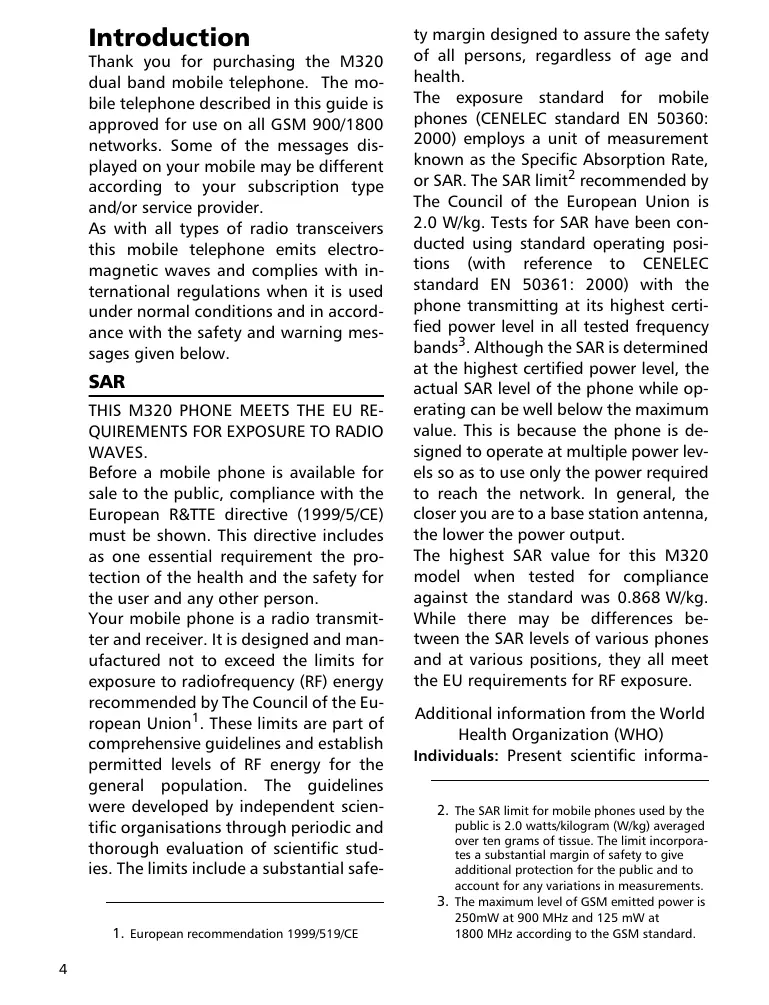 Thank you for purchasing the M320 dual band mobile telephone. The mobile telephone described in this guide is approved for use on all GSM 900/1800 networks. Some of the messages displayed on your mobile may be different according to your subscription type and/or service provider.