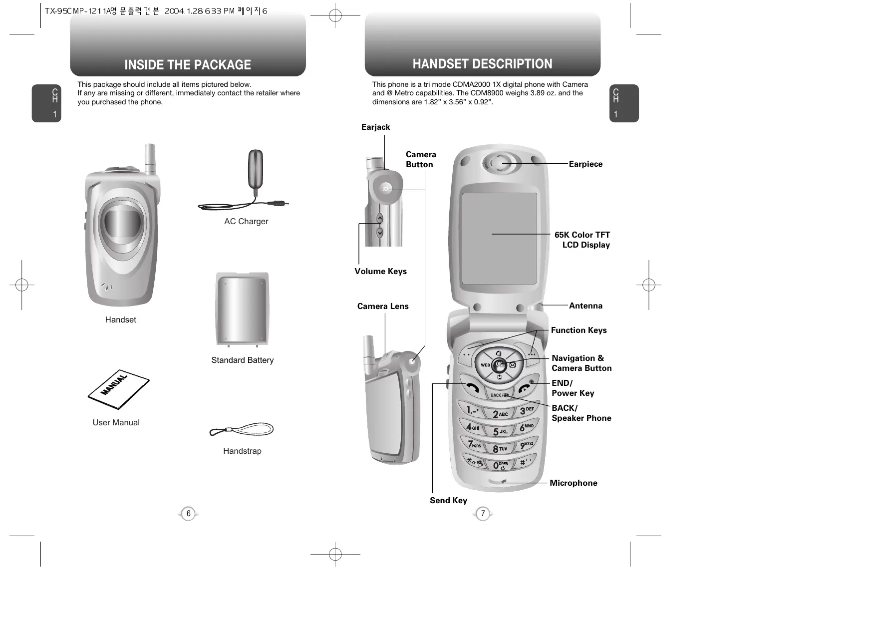 TX9SCMP-121 144 BEA TE 204.128 32 PM MO A 1 —5— WELCOME Thank you for choosing the up-to-date CDM-8900, our new model, developed by top researchers to support the CDMA2000 1X system through Qualcomm-manufactured MSM6050 chips and CDMA technologies. This product allows for high speed communication services, such as web browsing, data & fax services, and a GUI animation menu. Among its many advanced features, the T9 input mode makes it much easier to enter letters. In addition, the VR (Voice Recognition) makes it more user friendly, with proven technologies including: = Full graphic display of 9 text input line and 1 icon line with variable font size. = Easy to dial through the VR feature. = Easy to enter letters through the T9 text input mode. = Enhanced for web browsing & data services (i.e.; wireless internet access, wireless fax send/receive, Openwave, UP browser) = GUI & Animation display compliant with CDMA2000 1X. = Full graphic main display - 65K color TFT. # Mobile Camera.(VGA 33Frames) # Navigation key and 25 keys aligned for more convenience. = Sophisticated features of speaker phone, and voice recognition. # Additional services of text messaging and Web browsing on top of authentication, call forwarding, call transfer, call waiting. IMPORTANT INFORMATION This CDM-8900 user guide contains very important information about how to handle and use the product. So please read this manual thoroughly, pay attention to the warranty on the back page and be alert to the exclusions and limitations of your warranty, which are related with the unauthorized use of components.
