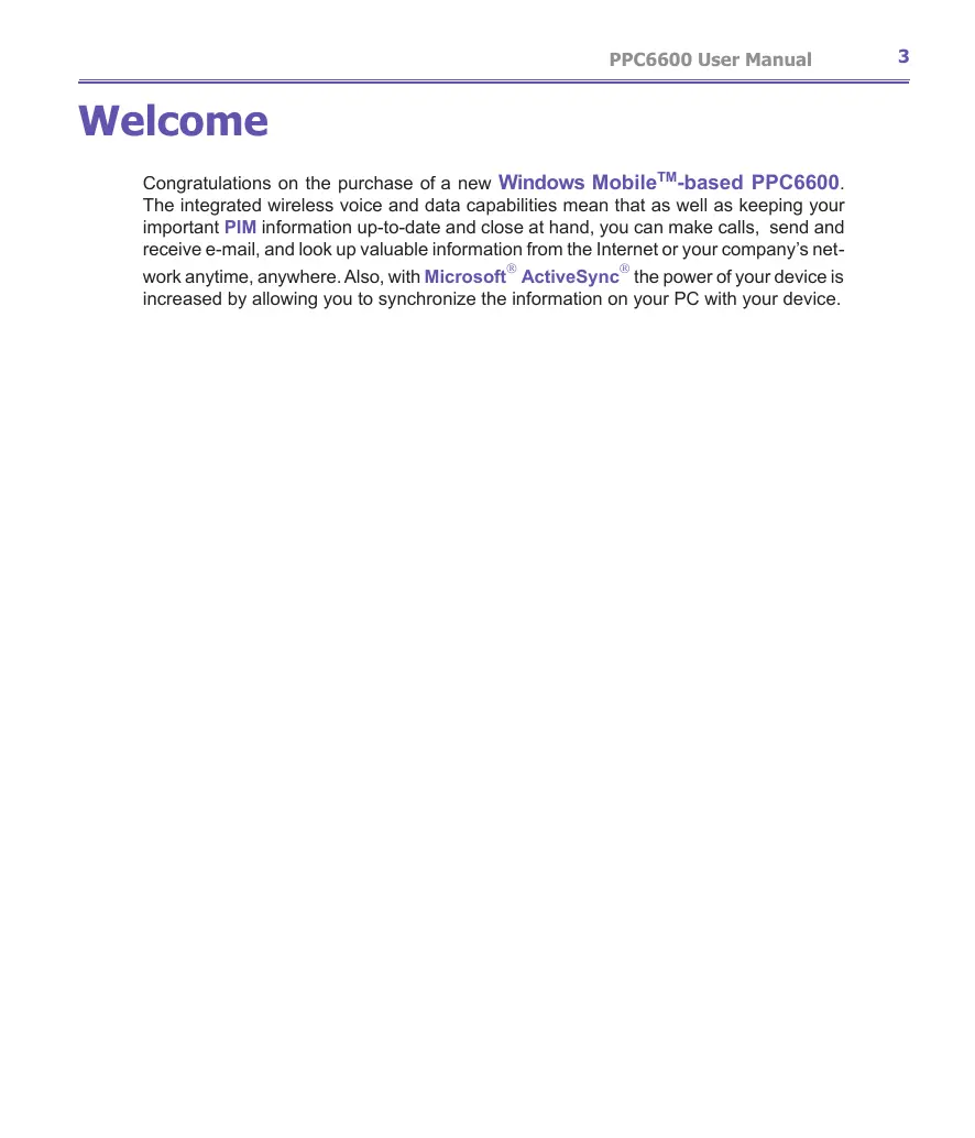 Congratulations on the purchase of a new Windows Mobile™-based PPC6600. The integrated wireless voice and data capabilities mean that as well as keeping your important PIM information up-to-date and close at hand, you can make calls, send and receive e-mail, and look up valuable information from the Internet or your company's network anytime, anywhere. Also, with Microsoft ActiveSync the power of your device is increased by allowing you to synchronize the information on your PC with your device.