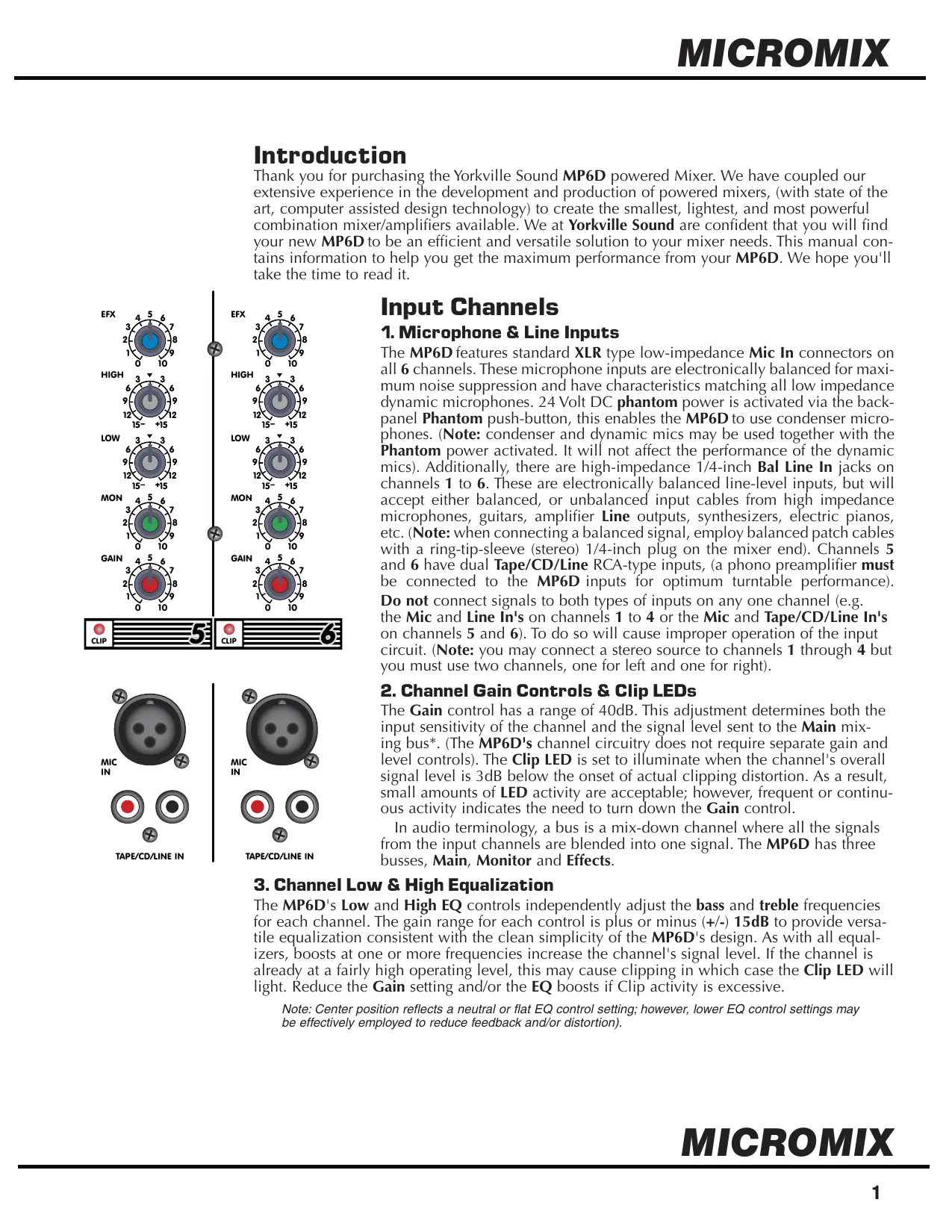 Thank you for purchasing the Yorkville Sound MP6D powered Mixer. We have coupled our extensive experience in the development and production of powered mixers, (with state of the art, computer assisted design technology) to create the smallest, lightest, and most powerful combination mixer/amplifiers available. We at Yorkville Sound are confident that you will find your new MP6D to be an efficient and versatile solution to your mixer needs. This manual contains information to help you get the maximum performance from your MP6D. We hope you'll take the time to read it. EFX 3 2 1 HIGH 6 9 12 LOW 6 9 12 MON 3 2 1 GAIN 3 2 1
