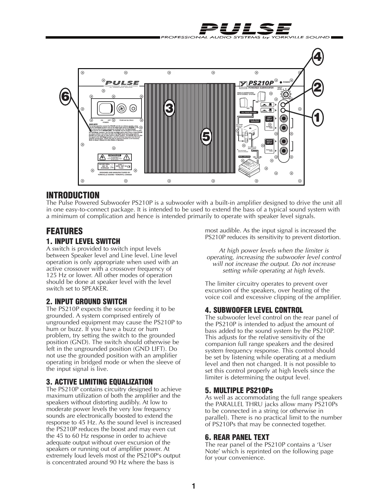 Q INTRODUCTION The Pulse Powered Subwoofer PS210P is a subwoofer with a built-in amplifier designed to drive the unit all in one easy-to-connect package. It is intended to be used to extend the bass of a typical sound system with a minimum of complication and hence is intended primarily to operate with speaker level signals.