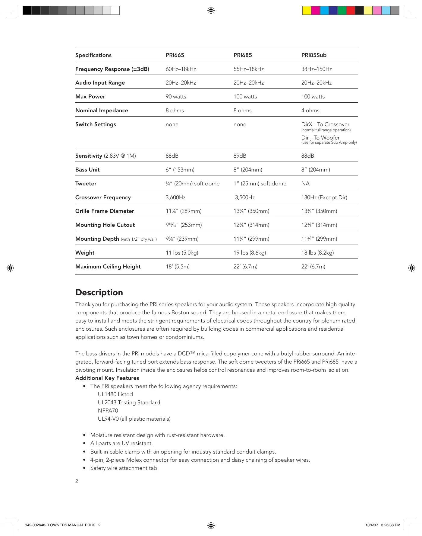 DIR 142-002648-D OWNERS MANUAL PRI.i1 1 10/4/07 3:26:37 PM Specifications PRi665 PRi685 PRi85Sub Frequency Response (±3dB) 60Hz–18kHz 55Hz–18kHz 38Hz–150Hz Audio Input Range 20Hz–20kHz 20Hz–20kHz 20Hz–20kHz Max Power 90 watts 100 watts 100 watts Nominal Impedance 8 ohms 8 ohms 4 ohms Switch Settings none none (normal full range operation) Dir - To Woofer (use for separate Sub Amp only) Mounting Hole Cutout 915⁄16” (253mm) 123⁄8” (314mm) 123⁄8” (314mm) Mounting Depth (with 1/2” dry wall) 93⁄8” (239mm) 113⁄4” (299mm) 113⁄4” (299mm) Weight 11 lbs (5.0kg) 19 lbs (8.6kg) 18 lbs (8.2kg) Maximum Ceiling Height 18’ (5.5m) 22’ (6.7m) 22’ (6.7m) Description Thank you for purchasing the PRi series speakers for your audio system. These speakers incorporate high quality components that produce the famous Boston sound. They are housed in a metal enclosure that makes them easy to install and meets the stringent requirements of electrical codes throughout the country for plenum rated enclosures. Such enclosures are often required by building codes in commercial applications and residential applications such as town homes or condominiums. The bass drivers in the PRi models have a DCD™ mica-filled copolymer cone with a butyl rubber surround. An integrated, forward-facing tuned port extends bass response. The soft dome tweeters of the PRi665 and PRi685 have a pivoting mount. Insulation inside the enclosures helps control resonances and improves room-to-room isolation. Additional Key Features