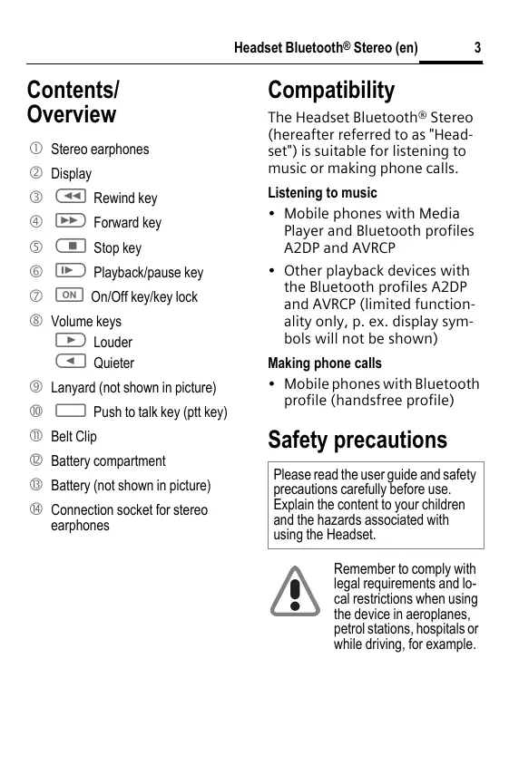 Contents/ Overview Q Stereo earphones à Display © CA Rewind key © C7) Forwardkey 5 CE] Stopkey © (#2 Playback/pause key 0] On/Off key/key lock ® Volume keys C>) Louder CI Quieter © Lanyard (not shown in picture) ® © Push totalkkey (pt key) @ Belt Clip @ Battery compartment @ Battery (not shoun in picture) ® Connection socket for stereo earphones Compatibility The Headset Bluetooth® Stereo (hereafter referred to as "Head- set”) is suitable for listening to music or making phone calls. Listening to music Mobile phones with Media Player and Bluetooth profiles A2DP and AVRCP Other playback devices with the Bluetooth profiles A2DP and AVRCP (limited function- ality only, p. ex. display sym- bols will not be shown) Making phone calls + Mobile phones with Bluetooth profile (handsfree profile) Safety precautions Please read the user guide and safety précautions carefull before use Explain the content to your children andthe hazards associated ith using the Headset. Remember to comply with legal requirements and lo- cal restrictions when using the device in aeroplanes, petrol stations, hospitals or while driving, for example.
