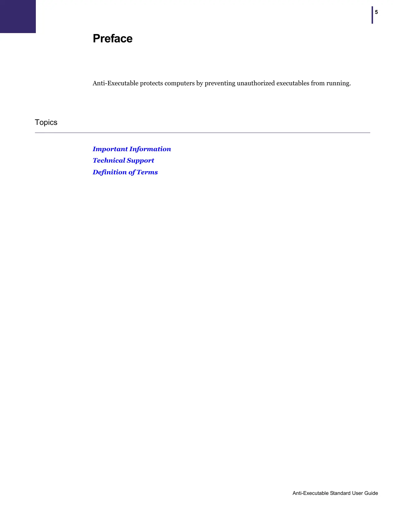 Preface Anti-Executable protects computers by preventing unauthorized executables from running. Topics Important Information Technical Support Definition of Terms Anti-Executable Standard User Guide