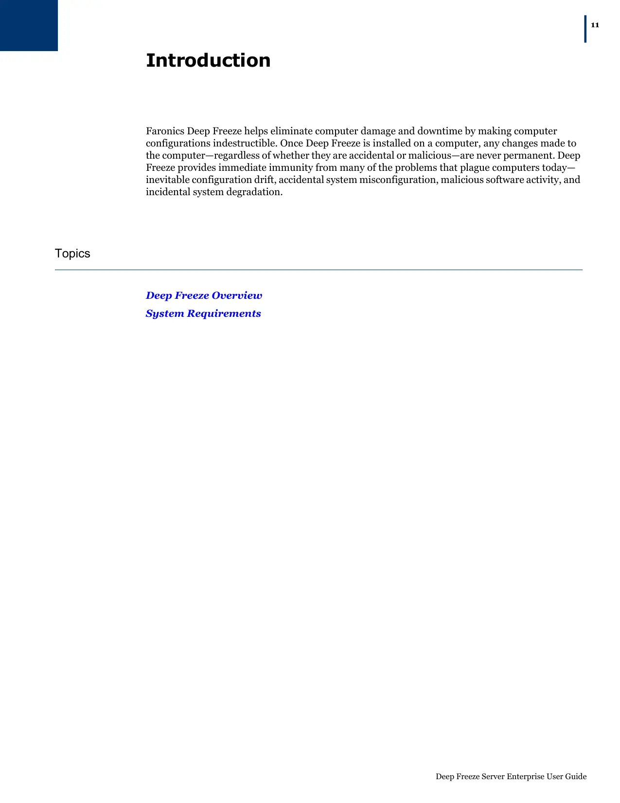 Introduction Faronics Deep Freeze helps eliminate computer damage and downtime by making computer configurations indestructible. Once Deep Freeze is installed on a computer, any changes made to the computer —regardless of whether they are accidental or malicious—are never permanent. Deep Freeze provides immediate immunity from many of the problems that plague computers today— inevitable configuration drift, accidental system misconfiguration, malicious software activity, and incidental system degradation. Deep Freeze Overview System Requirements Deep Freeze Server Enterprise User Guide