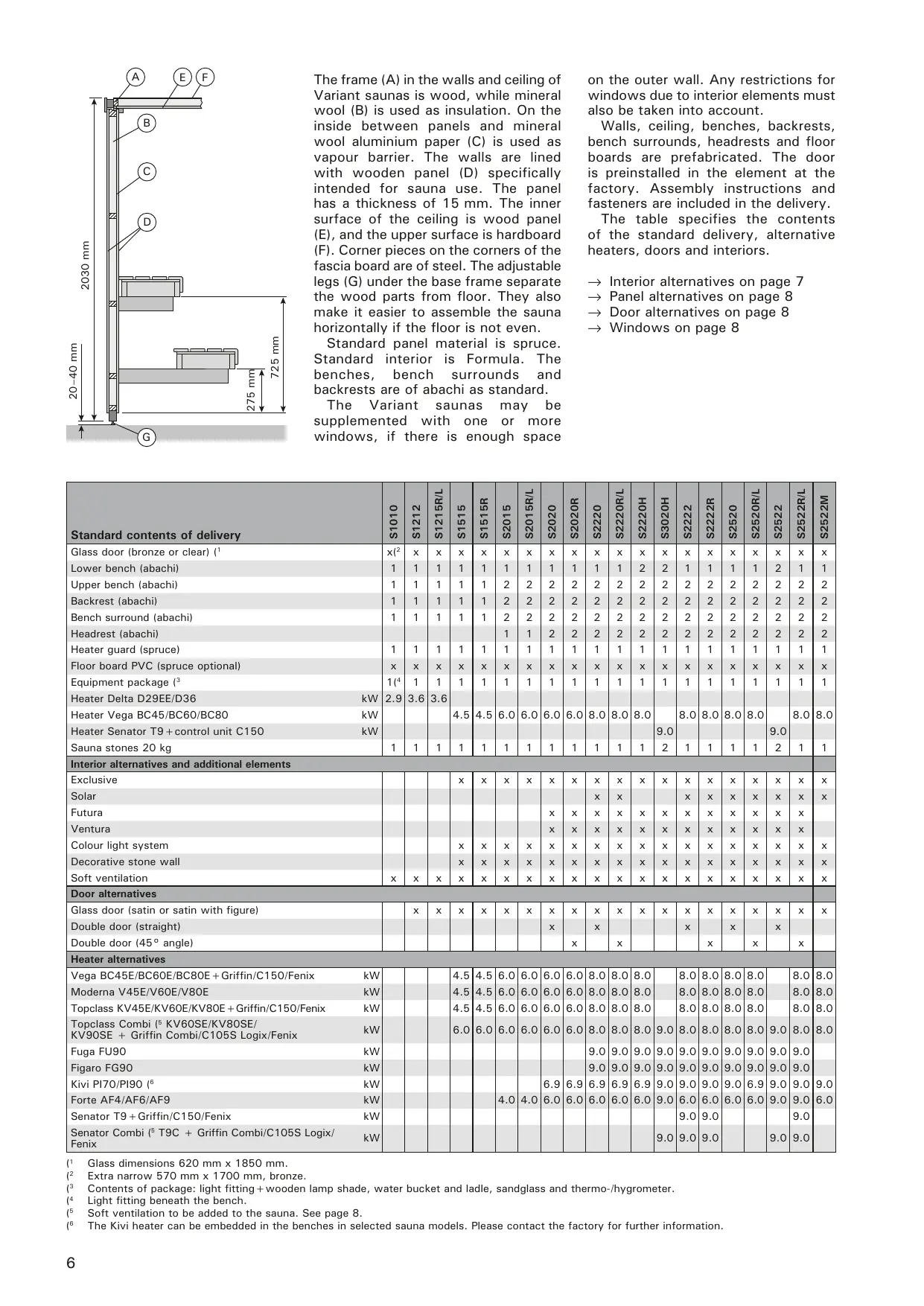 The frame (A) in the walls and ceiling of Variant saunas is wood, while mineral wool (B) is used as insulation. On the inside between panels and mineral wool aluminium paper (C) is used as vapour barrier. The walls are lined with wooden panel (D) specifically intended for sauna use. The panel has a thickness of 15mm . The inner surface of the ceiling is wood panel (E), and the upper surface is hardboard (F). Corner pieces on the corners of the fascia board are of steel. The adjustable legs (G) under the base frame separate the wood parts from floor. They also make it easier to assemble the sauna horizontally if the floor is not even.