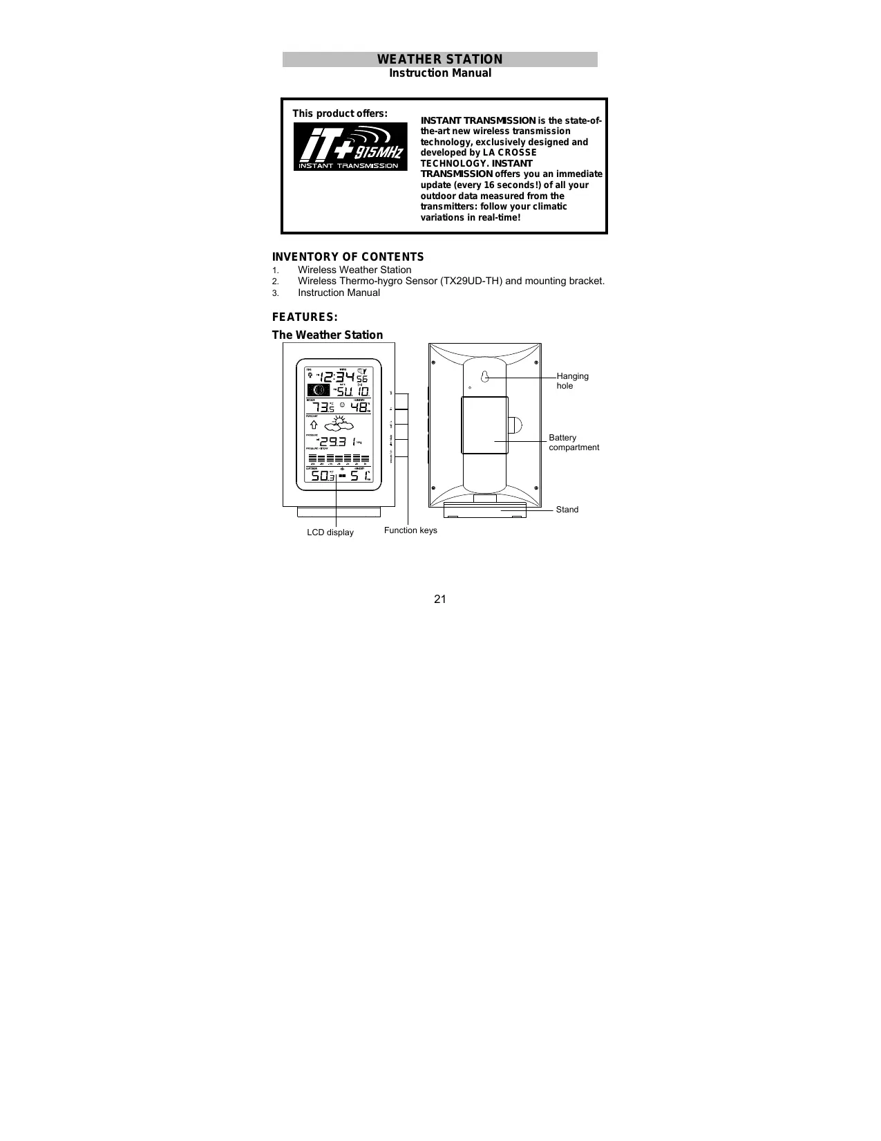 Download the instructions for your Weather Station in PDF format for free! Find your manual WS-9037U-IT - LA CROSS TECHNOLOGY and take your electronic device back in hand. On this page are published all the documents necessary for the use of your device. WS-9037U-IT by LA CROSS TECHNOLOGY.