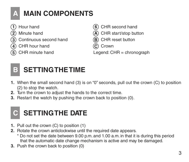 Do not set the date between 9.00 p.m. and 1.00 a.m. in that it is during this period that the automatic date change mechanism is active and may be damaged.