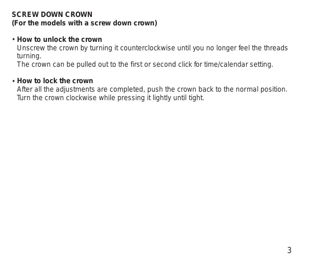After all the adjustments are completed, push the crown back to the normal position. Turn the crown clockwise while pressing it lightly until tight.