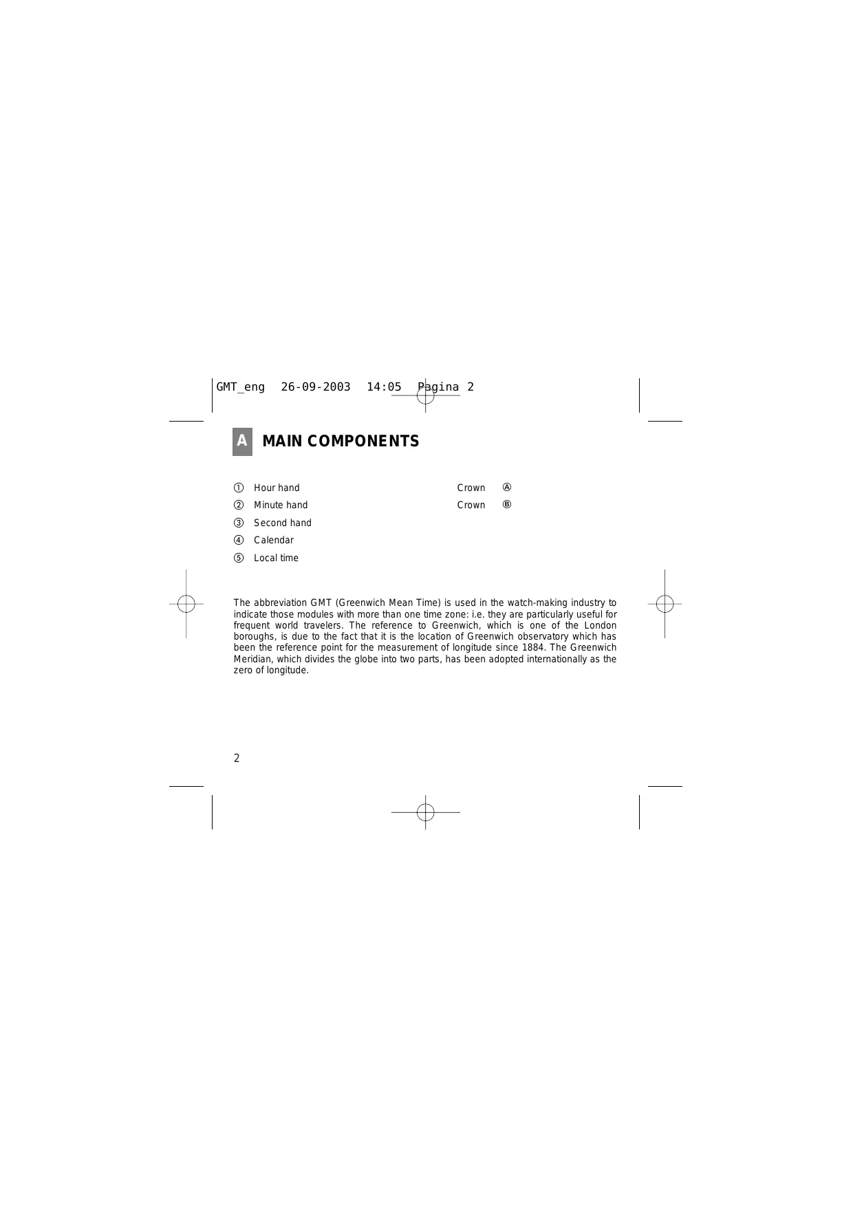 The abbreviation GMT (Greenwich Mean Time) is used in the watch-making industry to indicate those modules with more than one time zone: i.e. they are particularly useful for frequent world travelers. The reference to Greenwich, which is one of the London boroughs, is due to the fact that it is the location of Greenwich observatory which has been the reference point for the measurement of longitude since 1884. The Greenwich Meridian, which divides the globe into two parts, has been adopted internationally as the zero of longitude.