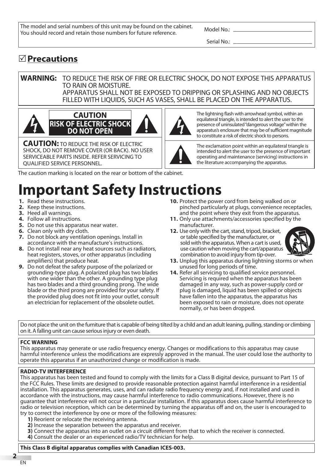 - Refer all servicing to qualified service personnel. Servicing is required when the apparatus has been damaged in any way, such as power-supply cord or plug is damaged, liquid has been spilled or objects have fallen into the apparatus, the apparatus has been exposed to rain or moisture, does not operate normally, or has been dropped.