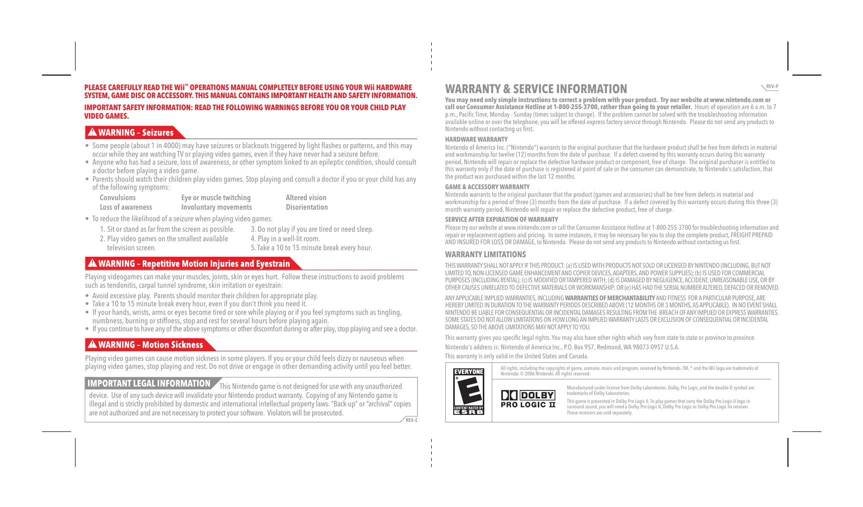 REV–P You may need only simple instructions to correct a problem with your product. Try our website at www.nintendo.com or call our Consumer Assistance Hotline at 1-800-255-3700, rather than going to your retailer. Hours of operation are 6 a.m. to 7 p.m., Pacific Time, Monday - Sunday (times subject to change). If the problem cannot be solved with the troubleshooting information available online or over the telephone, you will be offered express factory service through Nintendo. Please do not send any products to Nintendo without contacting us first. HARDWARE WARRANTY Nintendo of America Inc. ("Nintendo") warrants to the original purchaser that the hardware product shall be free from defects in material and workmanship for twelve (12) months from the date of purchase. If a defect covered by this warranty occurs during this warranty period, Nintendo will repair or replace the defective hardware product or component, free of charge. The original purchaser is entitled to this warranty only if the date of purchase is registered at point of sale or the consumer can demonstrate, to Nintendo's satisfaction, that the product was purchased within the last 12 months.