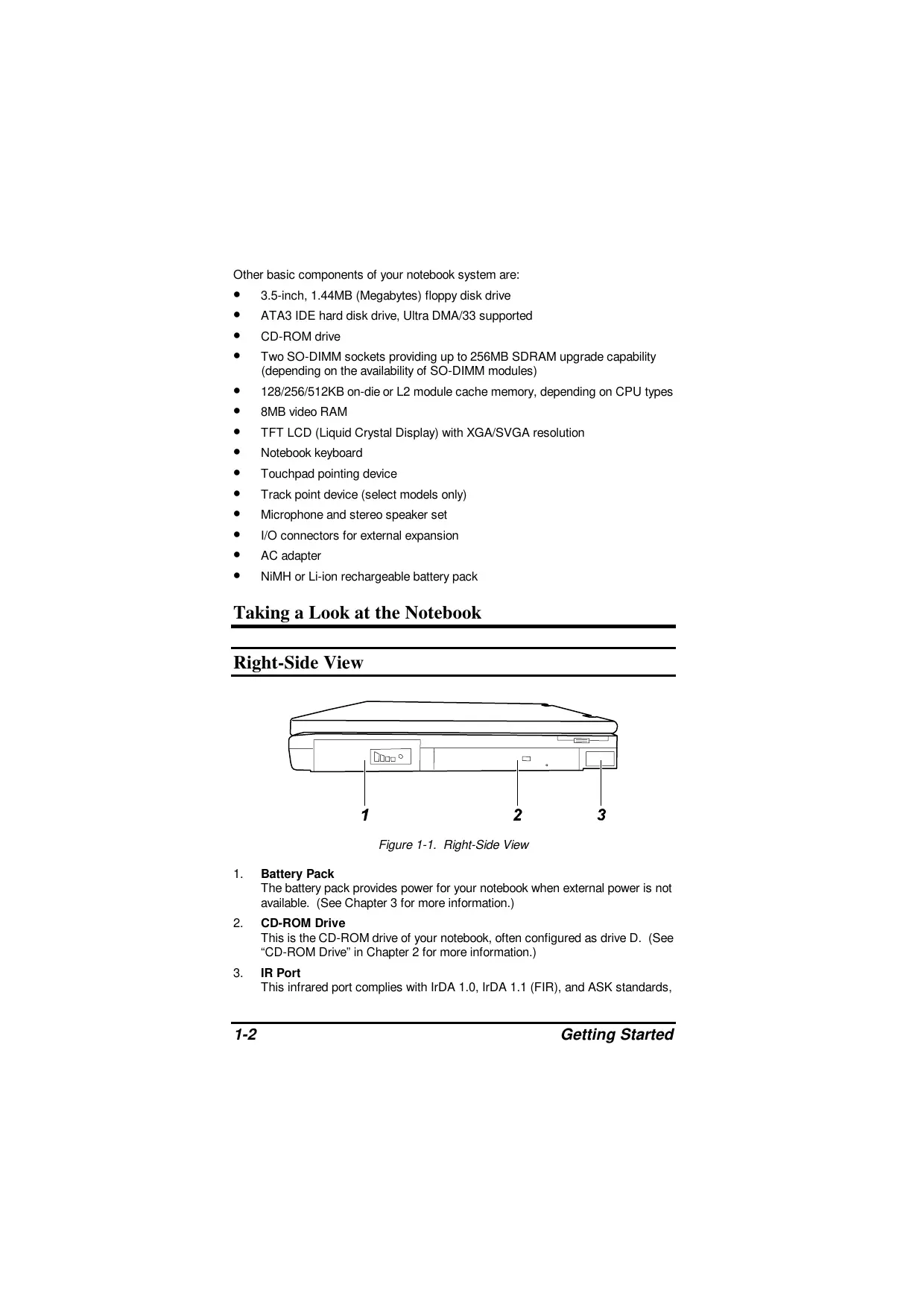 3.5-inch, 1.44MB (Megabytes) floppy disk drive ATA3 IDE hard disk drive, Ultra DMA/33 supported CD-ROM drive Two SO-DIMM sockets providing up to 256MB SDRAM upgrade capability (depending on the availability of SO-DIMM modules) 128/256/512KB on-die or L2 module cache memory, depending on CPU types 8MB video RAM TFT LCD (Liquid Crystal Display) with XGA/SVGA resolution Notebook keyboard Touchpad pointing device Track point device (select models only) Microphone and stereo speaker set I/O connectors for external expansion AC adapter NiMH or Li-ion rechargeable battery pack Taking a Look at the Notebook Right-Side View Figure 1-1. Right-Side View