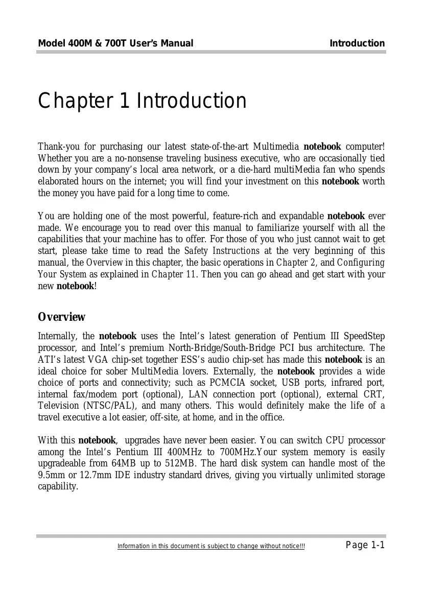 Thank-you for purchasing our latest state-of-the-art Multimedia notebook computer! Whether you are a no-nonsense traveling business executive, who are occasionally tied down by your company’s local area network, or a die-hard multiMedia fan who spends elaborated hours on the internet; you will find your investment on this notebook worth the money you have paid for a long time to come. You are holding one of the most powerful, feature-rich and expandable notebook ever made. We encourage you to read over this manual to familiarize yourself with all the capabilities that your machine has to offer. For those of you who just cannot wait to get start, please take time to read the Safety Instructions at the very beginning of this manual, the Overview in this chapter, the basic operations in Chapter 2, and Configuring Your System as explained in Chapter 11. Then you can go ahead and get start with your new notebook! Overview Internally, the notebook uses the Intel’s latest generation of Pentium III SpeedStep processor, and Intel’s premium North-Bridge/South-Bridge PCI bus architecture. The ATI’s latest VGA chip-set together ESS’s audio chip-set has made this notebook is an ideal choice for sober MultiMedia lovers. Externally, the notebook provides a wide choice of ports and connectivity; such as PCMCIA socket, USB ports, infrared port, internal fax/modem port (optional), LAN connection port (optional), external CRT, Television (NTSC/PAL), and many others. This would definitely make the life of a travel executive a lot easier, off-site, at home, and in the office. With this notebook, upgrades have never been easier. You can switch CPU processor among the Intel’s Pentium III 400MHz to 700MHz.Your system memory is easily upgradeable from 64MB up to 512MB. The hard disk system can handle most of the 9.5mm or 12.7mm IDE industry standard drives, giving you virtually unlimited storage capability. Information in this document is subject to change without notice!!! Page 1-1 Introduction Model 400M & 700T User’s Manual Battery life (or more appropriately the duration of which a notebook unit be able to operate without an AC outlet) is an important issue. Knowing this, we have incorporated the latest Advanced Power Management (APM) and/or Advanced Configuration Power Interface (ACPI) for energy saving. While we hope that this overview has made you aware of some the most exciting features of your new computer, there is still much more to the notebook. The remainder of this manual is dedicated to helping you get the most out of your new notebook. Please read each chapter carefully and we recommend you to explore each of the explained functions. Now, read on to find out more about what the amazing notebook can do for you! Page 1-2 Information in this document is subject to change without notice!!! Model 400M & 700T User’s Manual Introduction