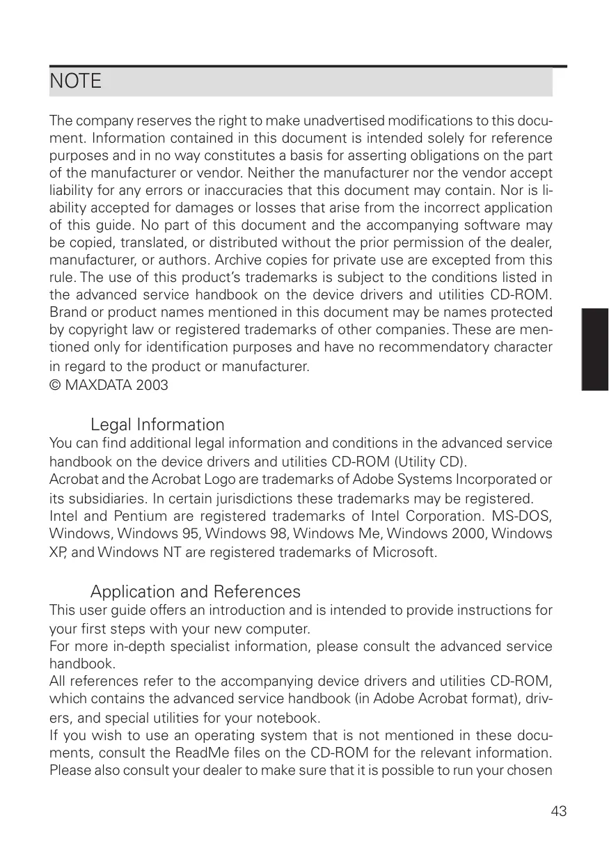 NOTE The company reserves the right to make unadvertised modifications to this docu- ment. Information contained in this document is intended solely for reference purposes and in no way constitutes a basis for asserting obligations on the part of the manufacturer or vendor. Neither the manufacturer nor the vendor accept liability for any errors or inaccuracies that this document may contain. Nor is li- ability accepted for damages or losses that arise from the incorrect application of this guide. No part of this document and the accompanying software may be copied, translated, or distributed without the prior permission of the dealer, manufacturer, or authors. Archive copies for private use are excepted from this rule. The use of this product's trademarks is subject to the conditions listed in the advanced service handbook on the device drivers and utilities CD-ROM. Brand or product names mentioned in this document may be names protected by copyright law or registered trademarks of other companies. These are men- tioned only for identification purposes and have no recommendatory character in regard to the product or manufacturer. © MAXDATA 2003 Legal Information You can find additional legal information and conditions in the advanced service handbook on the device drivers and utilities CD-ROM (Utility CD). Acrobat and the Acrobat Logo are trademarks of Adobe Systems Incorporated or its subsidiaries. In certain jurisdictions these trademarks may be registered. Intel and Pentium are registered trademarks of Intel Corporation. MS-DOS, Windows, Windows 95, Windows 98, Windows Me, Windows 2000, Windows XP and Windows NT are registered trademarks of Microsoft. Application and References This user guide offers an introduction and is intended to provide instructions for your first steps with your new computer. For more in-depth specialist information, please consult the advanced service handbook. All references refer to the accompanying device drivers and utilities CD-ROM, which contains the advanced service handbook (in Adobe Acrobat format}, driv- ers, and special utilities for your notebook. If you wish to use an operating system that is not mentioned in these docu- ments, consult the ReadMe files on the CD-ROM for the relevant information. Please also consult your dealer to make sure that itis possible to run your chosen