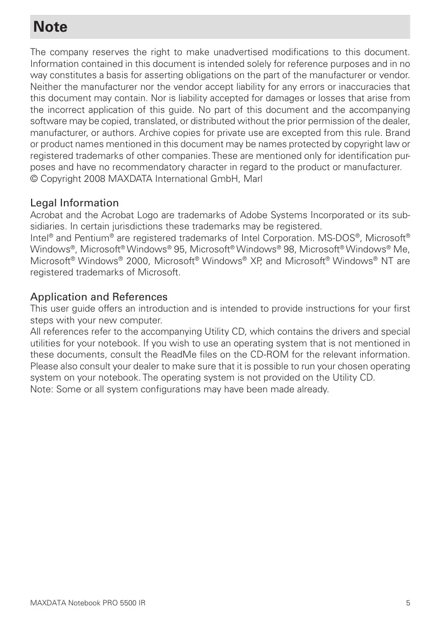 Note The company reserves the right to make unadvertised modifications to this document. Information contained in this document is intended solely for reference purposes and in no way constitutes a basis for asserting obligations on the part of the manufacturer or vendor. Neither the manufacturer nor the vendor accept liability for any errors or inaccuracies that this document may contain. Nor is liability accepted for damages or losses that arise from the incorrect application of this guide. No part of this document and the accompanying software may be copied, translated, or distributed without the prior permission of the dealer, manufacturer, or authors. Archive copies for private use are excepted from this rule. Brand or product names mentioned in this document may be names protected by copyright law or registered trademarks of other companies. These are mentioned only for identification pur poses and have no recommendatory character in regard to the product or manufacturer. © Copyright 2008 MAXDATA International GmbH, Marl Legal Information Acrobat and the Acrobat Logo are trademarks of Adobe Systems Incorporated or its sub- sidiaries. In certain jurisdictions these trademarks may be registered. Intel® and Pentium® are registered trademarks of Intel Corporation. MS-DOS®, Microsoft® Windows®, Microsoft® Windows® 95, Microsoft® Windows® 98, Microsoft® Windows® Me, Microsoft® Windows® 2000, Microsoft® Windows® XP and Microsoft® Windows® NT are registered trademarks of Microsoft. Application and References This user guide offers an introduction and is intended to provide instructions for your first steps with your new computer. All references refer to the accompanying Utility CD, which contains the drivers and special utilities for your notebook. If you wish to use an operating system that is not mentioned in these documents, consult the ReadMe files on the CD-ROM for the relevant information. Please also consult your dealer to make sure that it is possible to run your chosen operating system on your notebook. The operating system is not provided on the Utility CD. Note: Some or all system configurations may have been made already. MAXDATA Notebook PRO 5500 IR 5