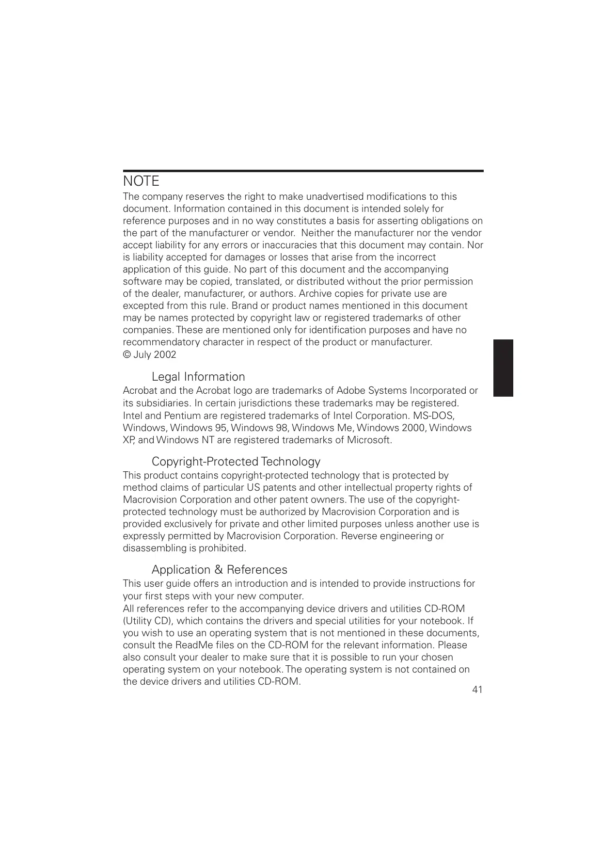 NOTE The company reserves the right to make unadvertised modifications to this document. Information contained in this document is intended solely for reference purposes and in no way constitutes a basis for asserting obligations on the part of the manufacturer or vendor. Neither the manufacturer nor the vendor accept liability for any errors or inaccuracies that this document may contain. Nor is liability accepted for damages or losses that arise from the incorrect application of this guide. No part of this document and the accompanying software may be copied, translated, or distributed without the prior permission of the dealer, manufacturer, or authors. Archive copies for private use are excepted from this rule. Brand or product names mentioned in this document may be names protected by copyright law or registered trademarks of other companies. These are mentioned only for identification purposes and have no recommendatory character in respect of the product or manufacturer. © July 2002 Legal Information Acrobat and the Acrobat logo are trademarks of Adobe Systems Incorporated or its subsidiaries. In certain jurisdictions these trademarks may be registered. Intel and Pentium are registered trademarks of Intel Corporation. MS-DOS, Windows, Windows 95, Windows 98, Windows Me, Windows 2000, Windows XP and Windows NT are registered trademarks of Microsoft. Copyright-Protected Technology This product contains copyright-protected technology that is protected by method claims of particular US patents and other intellectual property rights of Macrovision Corporation and other patent owners. The use of the copyright- protected technology must be authorized by Macrovision Corporation and is provided exclusively for private and other limited purposes unless another use is expressly permitted by Macrovision Corporation. Reverse engineering or disassembling is prohibited. Application & References This user guide offers an introduction and is intended to provide instructions for your first steps with your new computer. All references refer to the accompanying device drivers and utilities CD-ROM {Utility CD), which contains the drivers and special utilities for your notebook. If you wish to use an operating system that is not mentioned in these documents, consult the ReadMe files on the CD-ROM for the relevant information. Please also consult your dealer to make sure that it is possible to run your chosen operating system on your notebook. The operating system is not contained on the device drivers and utilities CD-ROM. a