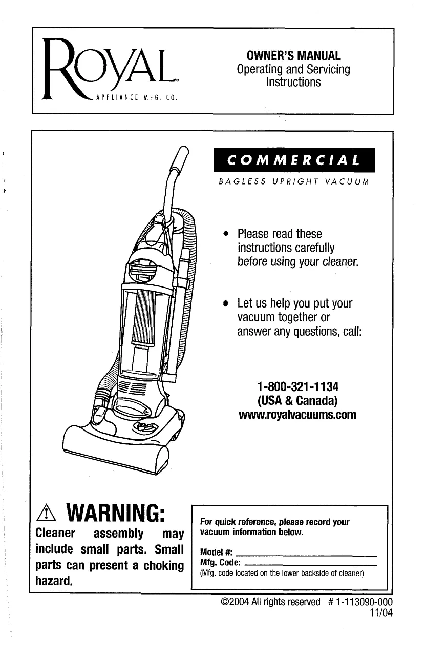 In the event that further assistance is required, see your Yellow Pages for an authorized Royal® Dealer. Costs of any transportation to and from any place of repair are to be paid by the owner. The service parts used in this unit are easily replaced and readily available from an authorized Royal® Dealer or retailer. Always identify your cleaner by the model number and manufacturing code when requesting information or ordering replacement parts. (The model number appears on the bottom of the cleaner.)