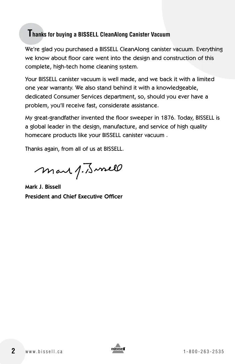 Thanks tor buying a BISSELL CleanAlong Canister Vacuum We're glad you purchased a BISSELL CleanAlong canister vacuum. Everything we know about floor care went into the design and construction of this complete, high-tech home cleaning system. Your BISSELL canister vacuum is well made, and we back it with a limited one year warranty. We also stand behind it with a knowledgeable, dedicated Consumer Services department, so, should you ever have a problem, you'll receive fast, considerate assistance. My great-grandfather invented the floor sweeper in 1876. Today, BISSELL is a global leader in the design, manufacture, and service of high quality homecare products like your BISSELL canister vacuum . Thanks again, from all of us at BISSELL. ne 7.474240 Mark J. Bissell President and Chief Executive Officer www.bissell.ca = 1-800-263-2535