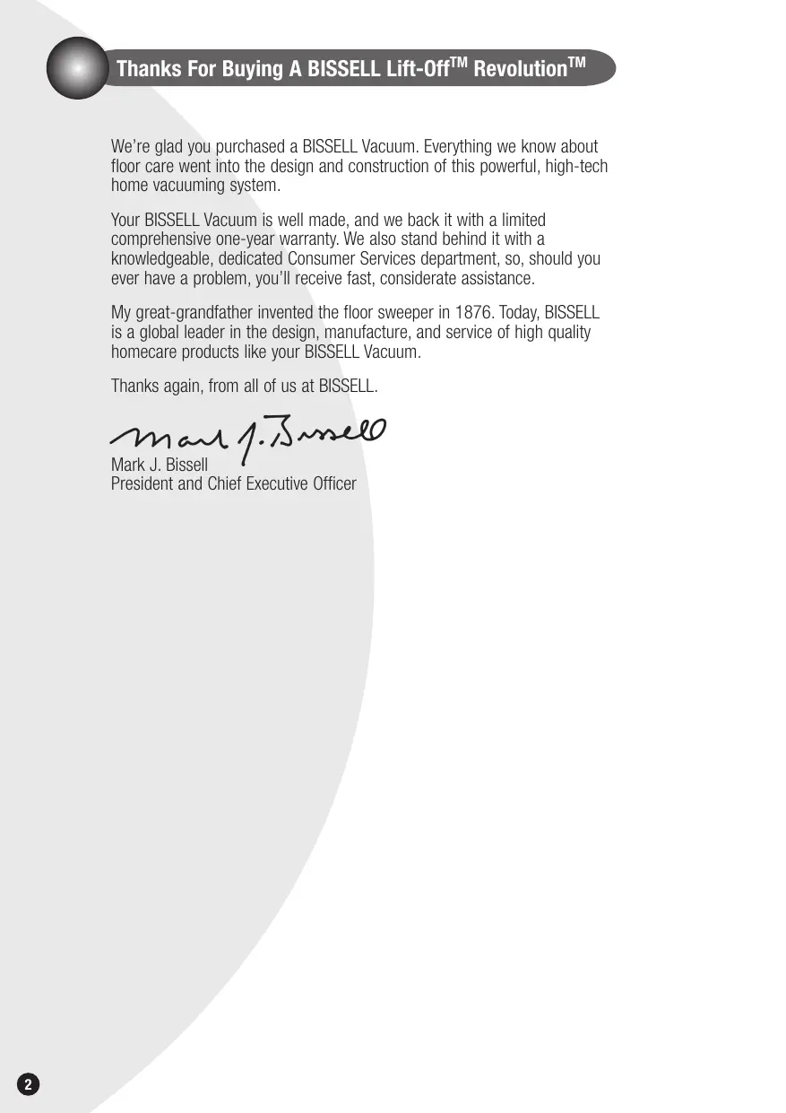 Thanks For Buying A BISSELL Lift-0ff"" Revol We're glad you purchased a BISSELL Vacuum. Everything we know about floor care went into the design and construction of this powerful, high-tech home vacuuming system. Your BISSELL Vacuum is well made, and we back it with a limited comprehensive one-year warranty. We also stand behind it with a knowledgeable, dedicated Consumer Services department, so, should you ever have a problem, you'll receive fast, considerate assistance. My great-grandfather invented the floor sweeper in 1876. Today, BISSELL is a global leader in the design, manufacture, and service of high quality homecare products like your BISSELL Vacuum. Thanks again, from all of us at BISSELL. Mn eA f.4 8440 Mark J. Bissell President and Chief Executive Officer