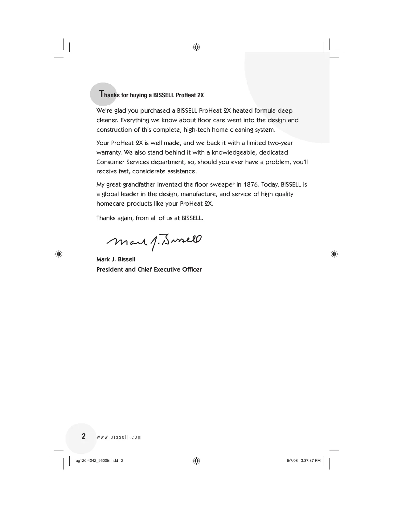 Thanks for buying a BISSELL ProHeat 2X We're glad you purchased a BISSELL ProHeat 2X heated formula deep cleaner. Everything we know about floor care went into the design and construction of this complete, high-tech home cleaning system. Your ProHeat 9X is well made, and we back it with a limited two-year warranty. We also stand behind it with a knowledgeable, dedicated Consumer Services department, so, should you ever have a problem, you'll receive fast, considerate assistance. My great-grandfather invented the floor sweeper in 1876. Today, BISSELL is a global leader in the design, manufacture, and service of high quality homecare products like your ProHeat 2X. Thanks again, from all of us at BISSELL. Met 7. A0 Mark J. Bissell s President and Chief Executive Officer www.bissell.com | ug120-4042_9500E.ndd 2 & sr7I08 3:37:37 pu | |