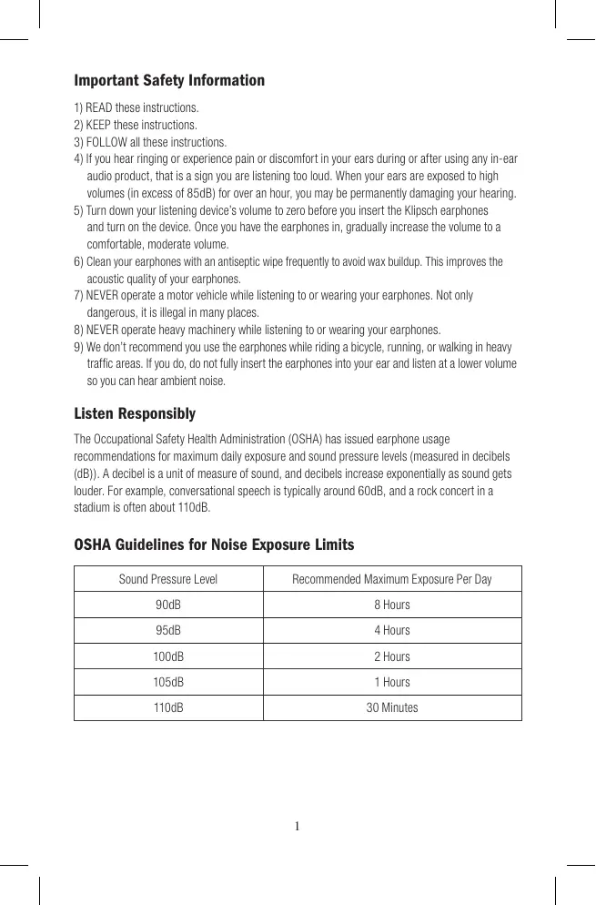 The Occupational Safety Health Administration (OSHA) has issued earphone usage recommendations for maximum daily exposure and sound pressure levels (measured in decibels (dB)). A decibel is a unit of measure of sound, and decibels increase exponentially as sound gets louder. For example, conversational speech is typically around 60dB, and a rock concert in a stadium is often about 110dB.