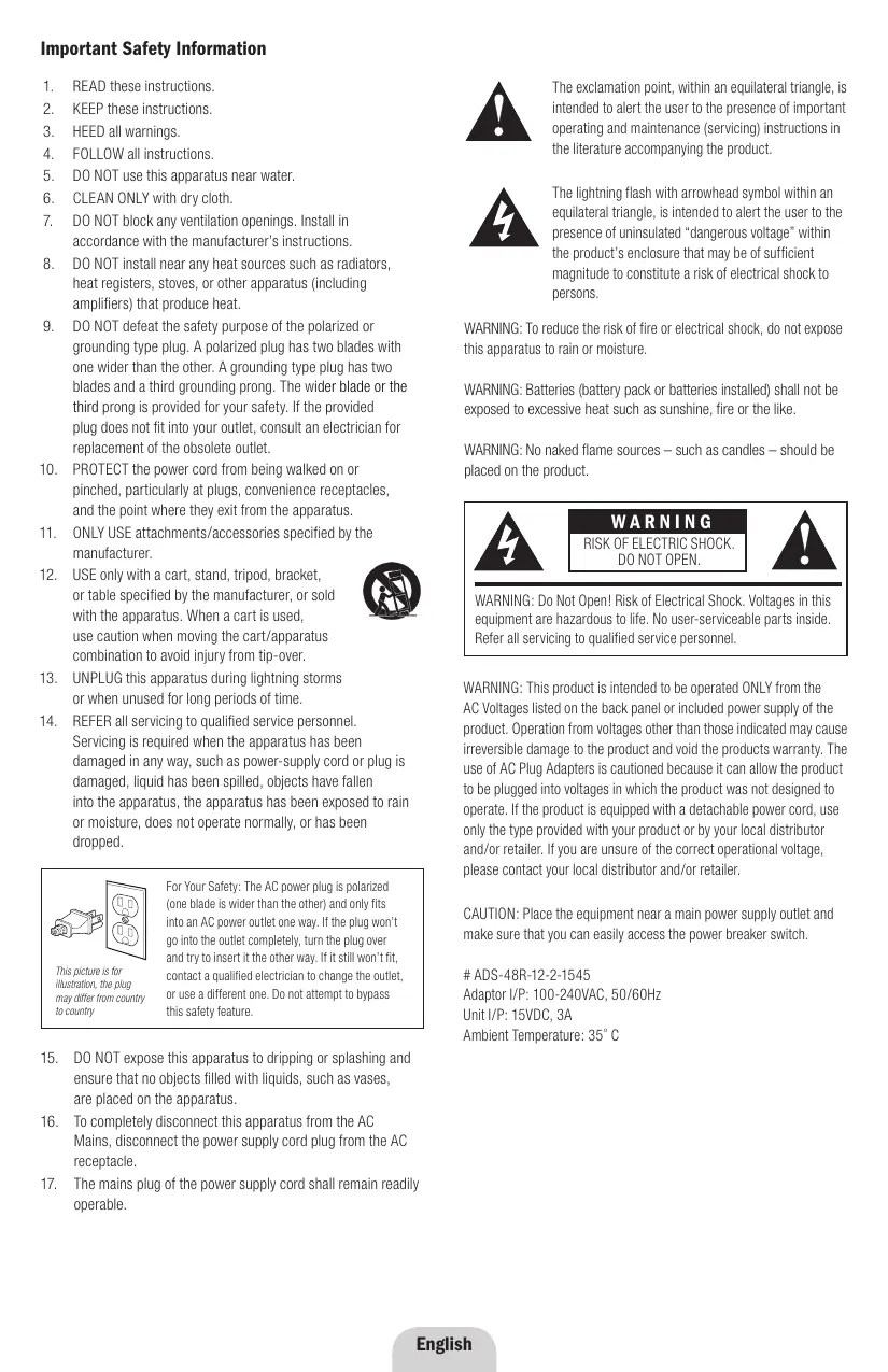 DO NOT OPEN. WARNING: Do Not Open! Risk of Electrical Shock. Voltages in this equipment are hazardous to life. No user-serviceable parts inside. Refer all servicing to qualified service personnel. WARNING: This product is intended to be operated ONLY from the AC Voltages listed on the back panel or included power supply of the product. Operation from voltages other than those indicated may cause irreversible damage to the product and void the products warranty. The use of AC Plug Adapters is cautioned because it can allow the product to be plugged into voltages in which the product was not designed to operate. If the product is equipped with a detachable power cord, use only the type provided with your product or by your local distributor and/or retailer. If you are unsure of the correct operational voltage, please contact your local distributor and/or retailer.