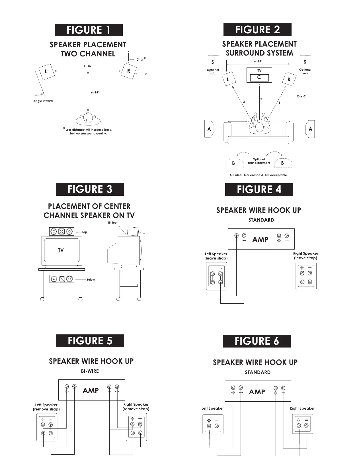 Conventional Connection — Using 16-gauge or larger speaker wire, connect the RED "positive" (+) terminal of the LEFT speaker to the RED "positive" (+) terminal of your amplifier's LEFT channel. Connect the BLACK "negative" (-) terminal of the LEFT speaker to the BLACK "negative" (-) terminal of your amplifier's LEFT channel. Repeat this procedure for connecting all remaining speakers to the appropriate amplifier channels. Refer to Figure 4 and 6. Make sure that no bare wires from any of the connections touch any other terminals as this could cause a short and damage your equipment. Some Reference models have two sets of input terminals connected by wire jumpers. For conventional connection, leave these jumpers in place, and use either set of terminals.