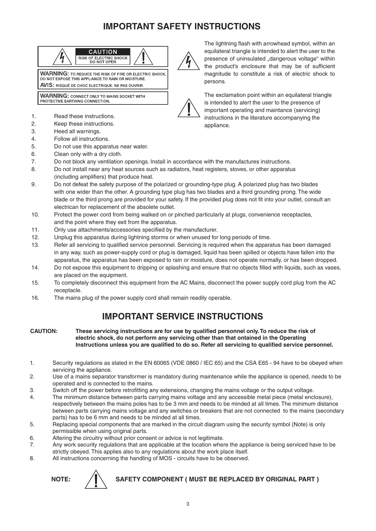 These servicing instructions are for use by qualified personnel only. To reduce the risk of electric shock, do not perform any servicing other than that ontained in the Operating Instructions unless you are qualified to do so. Refer all servicing to qualified service personnel. Security regulations as stated in the EN 60065 (VDE 0860 / IEC 65) and the CSA E65 - 94 have to be obeyed when servicing the appliance. Use of a mains separator transformer is mandatory during maintenance while the appliance is opened, needs to be operated and is connected to the mains. Switch off the power before retrofitting any extensions, changing the mains voltage or the output voltage. The minimum distance between parts carrying mains voltage and any accessible metal piece (metal enclosure), respectively between the mains poles has to be 3 mm and needs to be minded at all times. The minimum distance between parts carrying mains voltage and any switches or breakers that are not connected to the mains (secondary parts) has to be 6 mm and needs to be minded at all times. Replacing special components that are marked in the circuit diagram using the security symbol (Note) is only permissible when using original parts. Altering the circuitry without prior consent or advice is not legitimate. Any work security regulations that are applicable at the location where the appliance is being serviced have to be strictly obeyed. This applies also to any regulations about the work place itself. All instructions concerning the handling of MOS - circuits have to be observed. NOTE: SAFETY COMPONENT ( MUST BE REPLACED BY ORIGINAL PART )