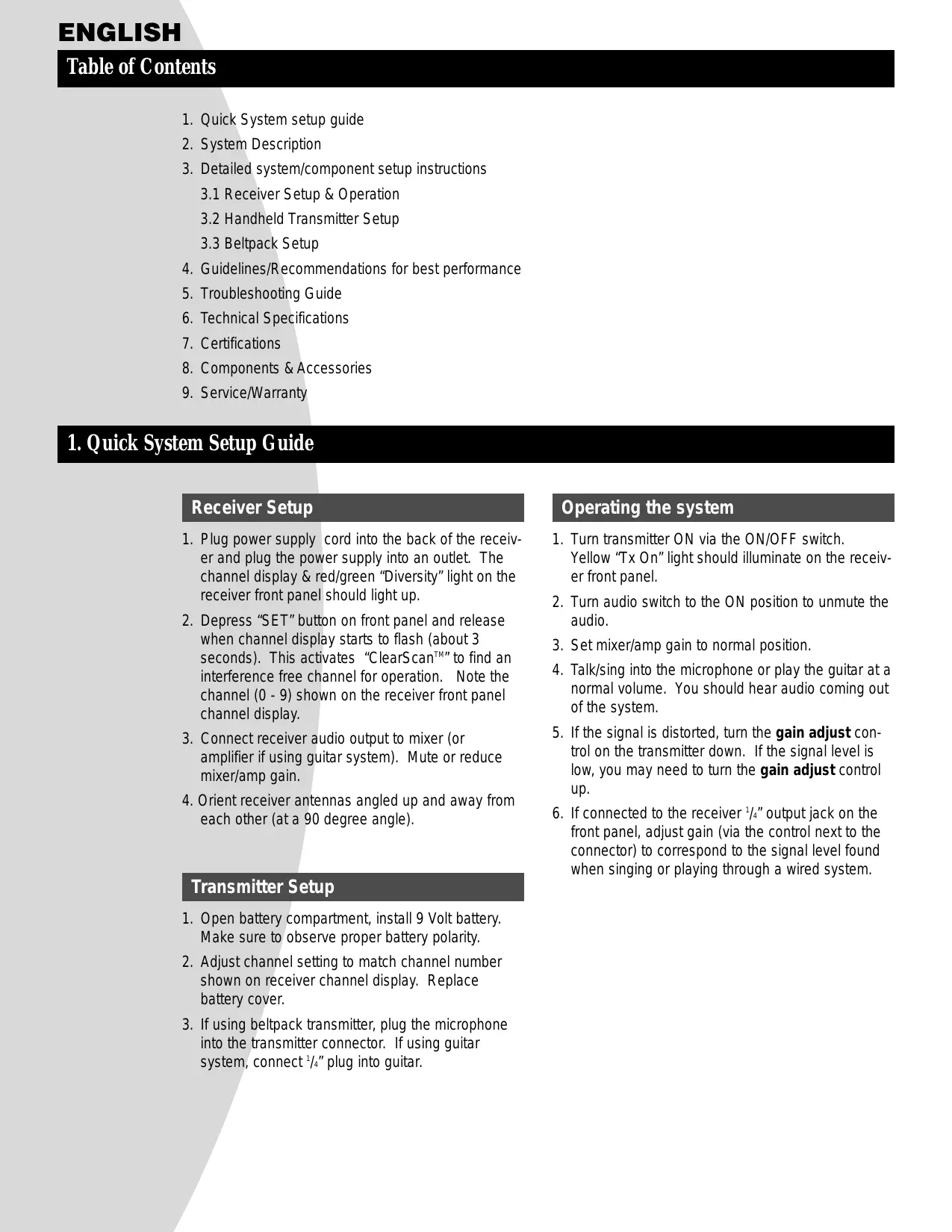 squelch control on the back of the receiver may be adjusted to effectively increase range or to reduce interference. The factory setting is at a midpoint, which should be suitable for most situations. To effectively increase range, turn the control counterclockwise until you hear noise or interference. Then, turn the squelch clockwise until the noise is muted. To reduce interference, turn the control clockwise. NOTE: If the squelch is being adjusted, the transmitter should be turned off. Caution! Increasing the range will make the system more susceptible to outside interference! Reducing interference will also effectively decrease the range, which will make the system more susceptible to dropouts. ENGLISH