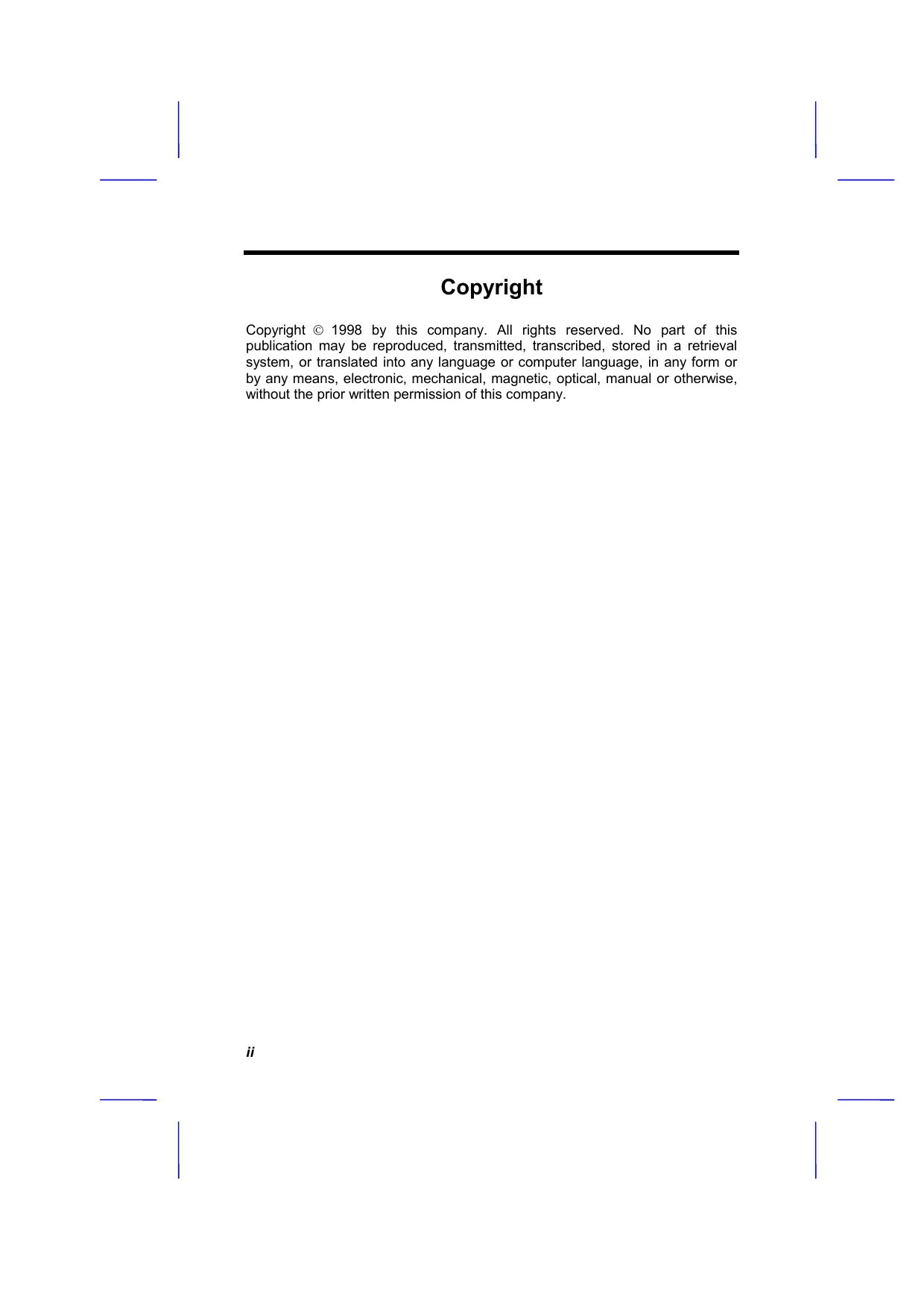 Copyright Copyright © 1998 by this company. All rights reserved. No part of this publication may be reproduced, transmitted, transcribed, stored in a retrieval system, or translated into any language or computer language, in any form or by any means, electronic, mechanical, magnetic, optical, manual or otherwise, without the prior written permission of this company.