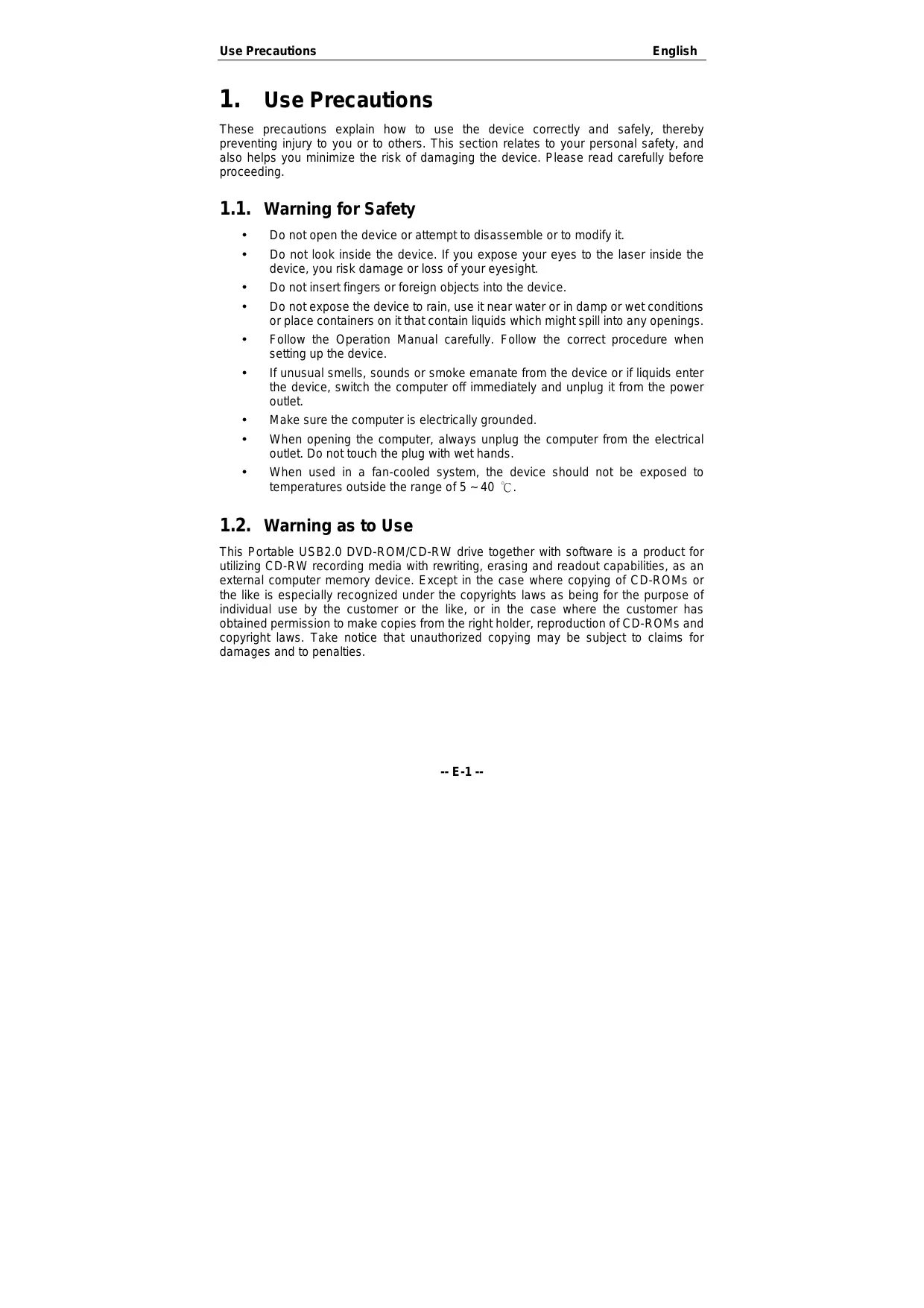 These precautions explain how to use the device correct and safely, thereby preventing injury to you or to others. This section relates to your personal safety, and also helps you minimize the risk of damaging the device. Please read carefully before proceeding, 1.1. Warning for Safety + Do notopen the device or attempt to disassemble or to modify it. + Do not look inside the device. If you expose your eyes to the laser inside the device, you risk damage or loss of your eyesight. + Do notinsertfingers or foreign objects into the device. + Do notexpose the device to rain, use itnear water or in damp or wet conditions or place containers on itthat contain liquids which might spill into any openings. + Follow the Operation Manual carefully. Follow the correct procedure when setting up the device. + Ifunusual smells, sounds or smoke emanate from the device or if liquids enter the device, switch the computer off immediately and unplug it from the power outet. + Make sure the computer is electrcally grounded. + When opening the computer, always unplug the computer from the electrical outet. Do nottouch the plug with wet hands. + When used in a fan-cooled system, the device should not be exposed to temperatures outside the range of 5 -40 C. 1.2. Warning as to Use This Portable USB2.0 DVD-ROM/CD-RW drive together with software is a product for utlizing CD-RW recording media with rewriting, erasing and readout capabilities, as an external computer memory device. Except in the case where copying of CD-ROMs or the like is especially recognized under the copyrights laws as being for the purpose of individual use by the customer or the like, or in the case where the customer has obtained permission to make copies from the right holder, reproduction of CD-ROMs and copyright laws. Take notice that unauthorized copying may be subject to claims for damages and to penalties.