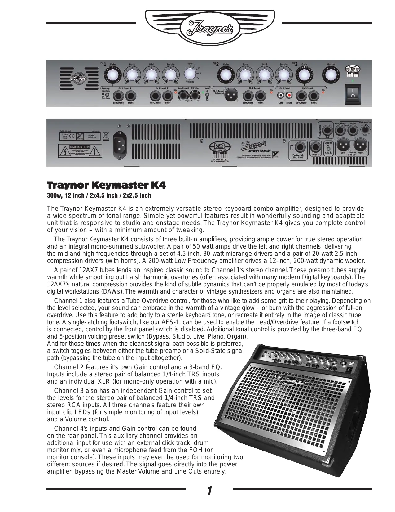 The Traynor Keymaster K4 is an extremely versatile stereo keyboard combo-amplifier, designed to provide a wide spectrum of tonal range. Simple yet powerful features result in wonderfully sounding and adaptable unit that is responsive to studio and onstage needs. The Traynor Keymaster K4 gives you complete control of your vision – with a minimum amount of tweaking.