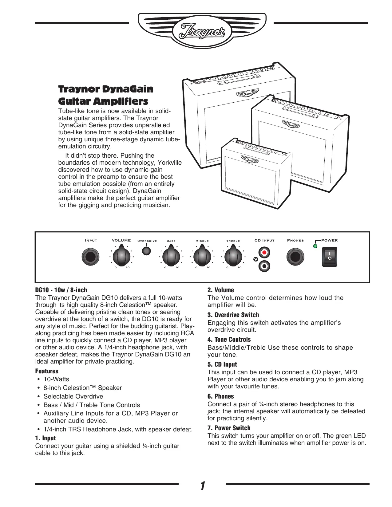 DG10 - 10w / 8-inch The Traynor DynaGain DG10 delivers a full 10-watts through its high quality 8-inch Celestion™ speaker. Capable of delivering pristine clean tones or searing overdrive at the touch of a switch, the DG10 is ready for any style of music. Perfect for the budding guitarist. Playalong practicing has been made easier by including RCA line inputs to quickly connect a CD player, MP3 player or other audio device. A 1/4-inch headphone jack, with speaker defeat, makes the Traynor DynaGain DG10 an ideal amplifier for private practicing.