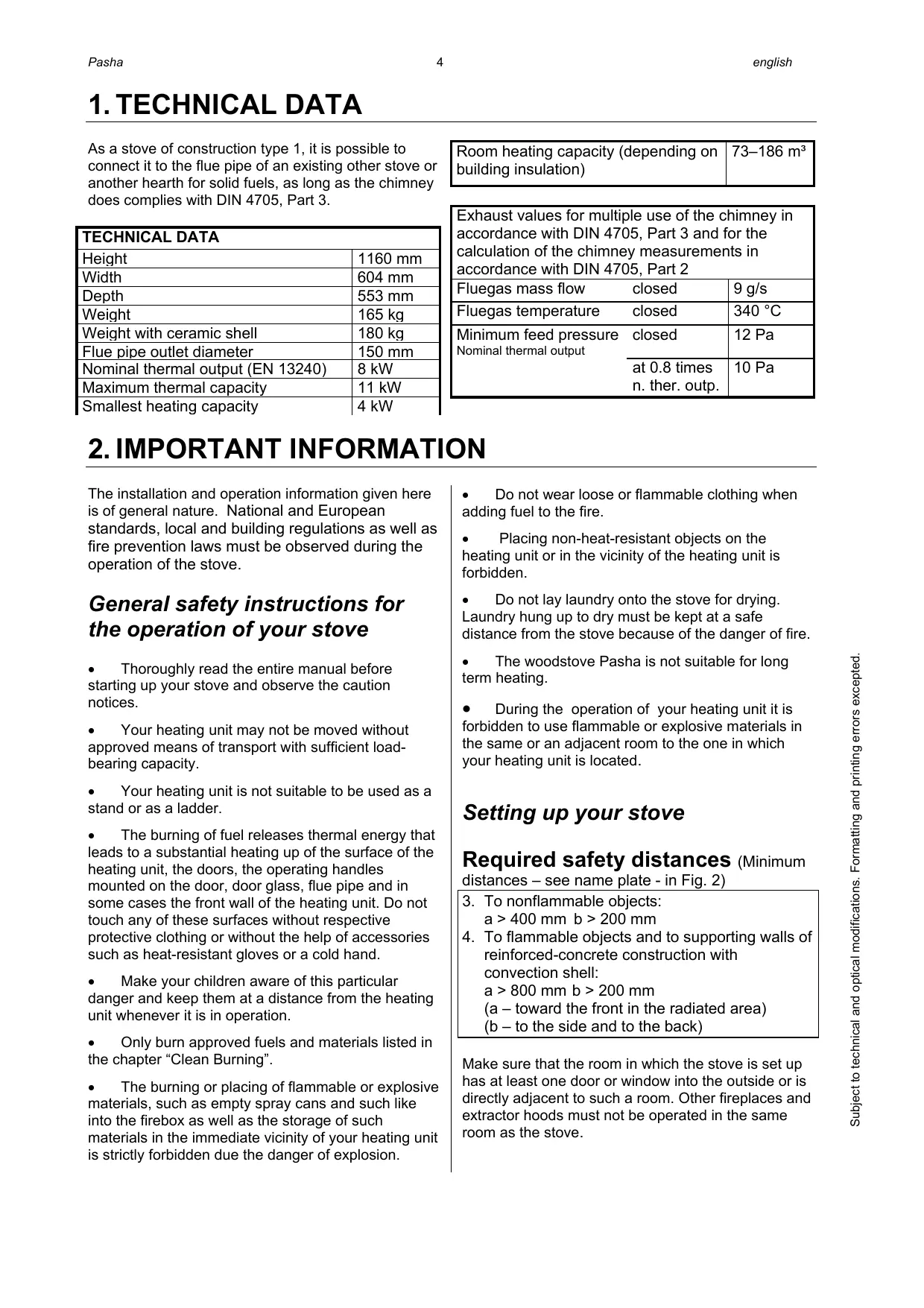 The installation and operation information given here is of general nature. National and European standards, local and building regulations as well as fire prevention laws must be observed during the operation of the stove.